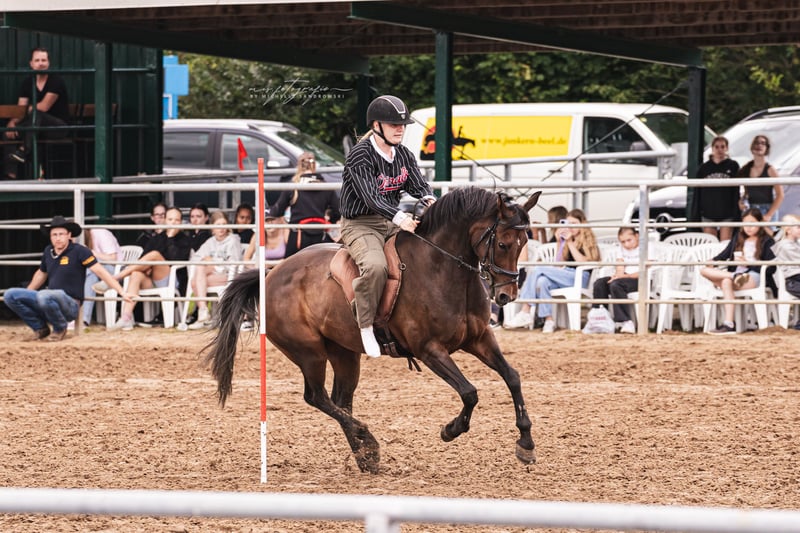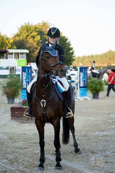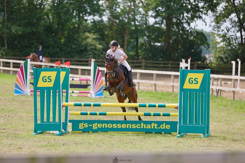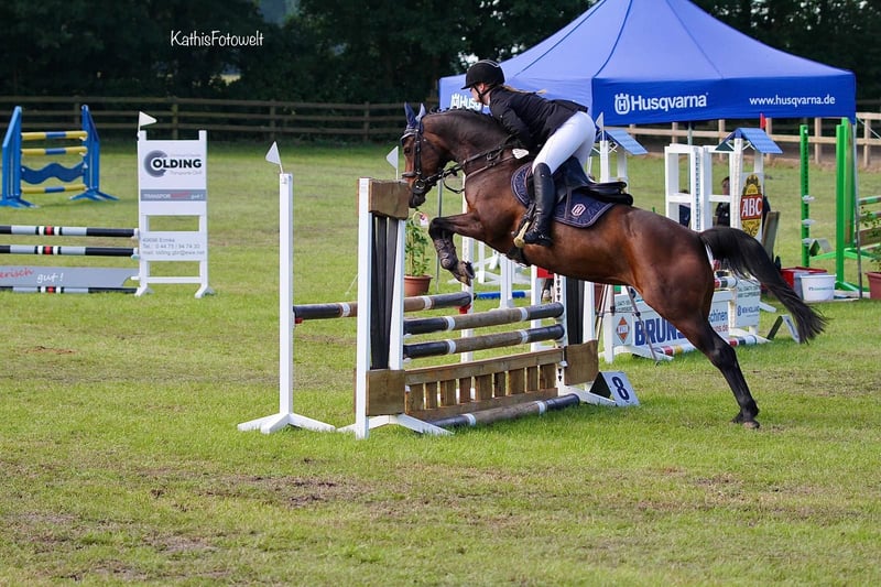 With a heavy heart, I am parting ways with my beloved 14-year-old German riding pony mare, Shalimar. She is truly a dream horse. She is well-behaved and handles everything with ease, whether it's jumping, eventing, groundwork, or lunging with a halter—she does it all. She is also not spooky and is comfortable in water. However, she is not suitable for beginners. She has competition experience up to A** level in show jumping and performs very well at competitions, as reflected in her placings. She is not sold to riding schools or similar operations. Please feel free to contact me if you have any questions.