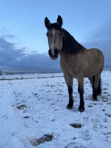 The mare and her half-sister have been with us for over 10 years, and she has extensive experience in the field. She enjoys participating in riding lessons as well as groundwork sessions. We have a lot of equipment for ground work and small jumps. Unfortunately, there is no riding arena nearby, but it is possible (for experienced and confident riders) to reach an indoor arena with a trailer, which is about 5 to 7 minutes away by car. Ideally, we are looking for someone who wants to build a personal relationship with the horse to create beautiful memories together. She is very gentle but appreciates a respectful rider she can trust. We are approximately 20 minutes from Kassel.
