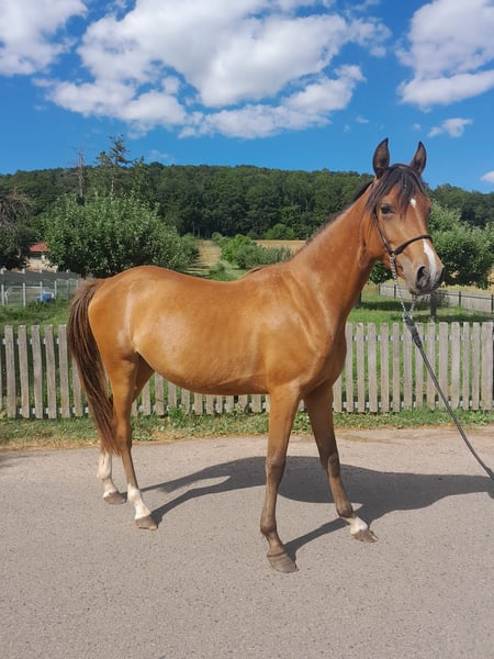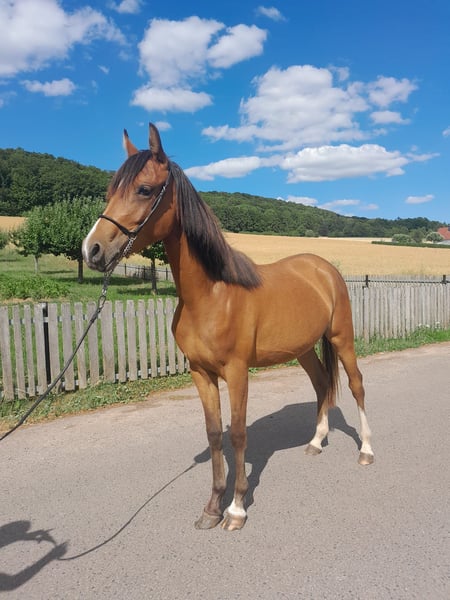 For sale is a charming and promising mare, a German Riding Pony cross, born in 2023. She has a beautiful brown coat and stands at 14.0 hands. This young lady is perfect for leisure riding and offers great potential for future adventures. She is well-mannered and already displays a solid basic training. Ideal for riders seeking a loving and reliable pony that brings joy both in the arena and on the trail.
