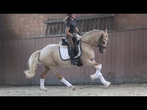 "Vienna Calling," or simply "Vinnie," is a promising young dressage pony mare. To start with the obvious, I would like to highlight her excellent basic gaits! She demonstrates balance in all three gaits and is already more than established at this young age. Particularly, her expansive trot and canter deserve explicit attention. The less obvious aspect is her character! Much like her wonderful golden coat color, it is also made of gold. Despite her young age, she handles all everyday situations with great skill and is very unflappable. In addition to regular riding in the arena, she is already familiar with trail riding and galloping over stubble fields, as well as free jumping (where she also makes a fantastic impression). Children have also ridden her and were able to "handle" her without any problems. Come by and see for yourself this quality and charming pony mare: 0176 80394797