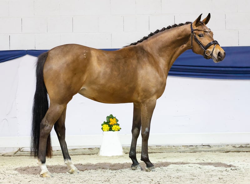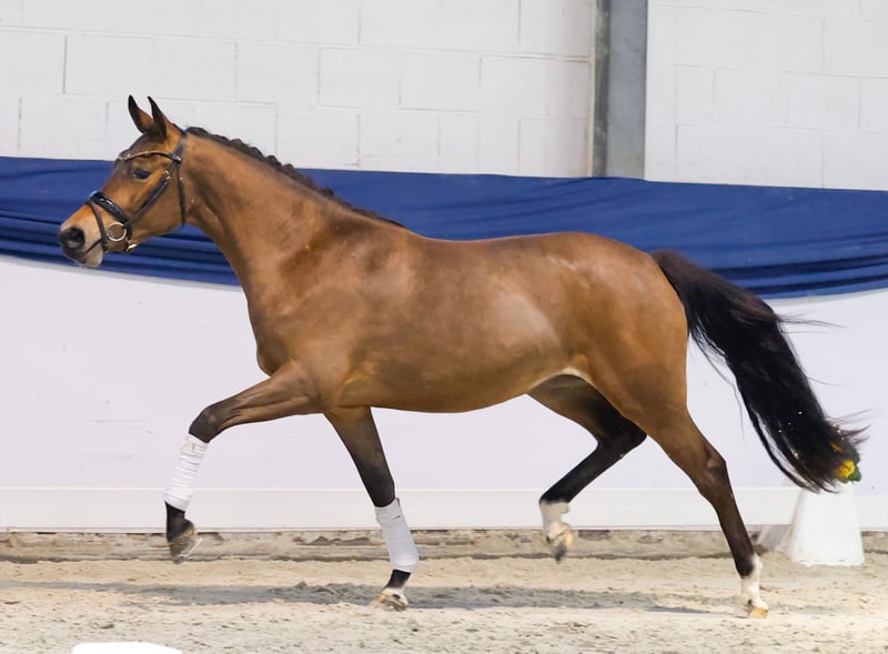 Our collection features carefully selected young horses suitable for all disciplines: training, breeding, and children's ponies. You can view the entire collection here: https://ponyforum.auction The sporty mare Nozomi is a daughter of the stallion Neverland WE, the breed survey winner, Bundeschampion, and FEI winner. She moves with a strong, expressive trot and an active hindquarters that beautifully pushes forward. Nozomi's dam was also highly successful in sport. She placed in M-level show jumping competitions, L-level cross-country events, and participated in the DJM Pony Eventing Championships! The dam line includes top performance bloodlines with Nantano and Marsvogel xx, both renowned for their double talent in breeding and sport.