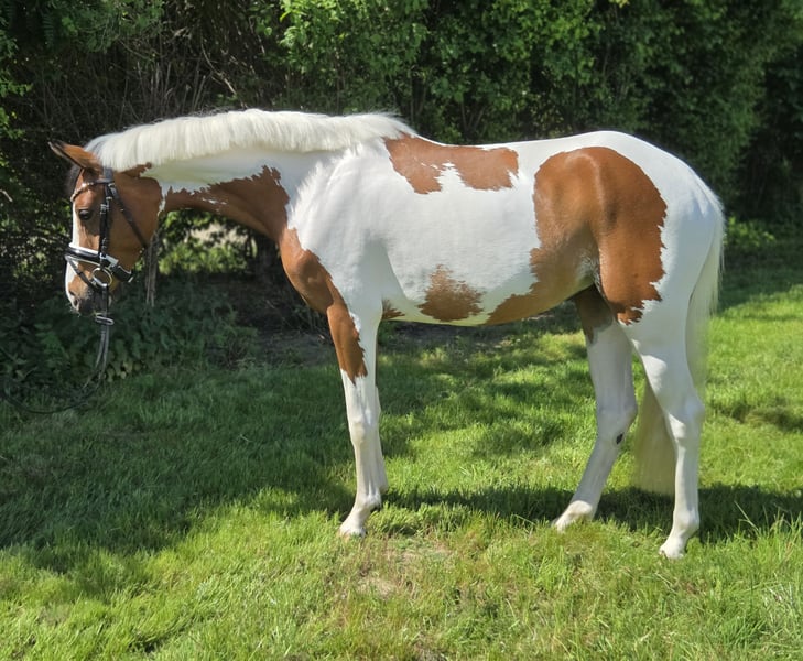 For sale is this striking daughter of Für immer Du. Colorful impresses daily with her balanced character and willingness to learn. Despite her young age of 3 years, she already shows a lot of composure and coolness in many, even unusual situations. She is currently being backed and has not made a single wrong step so far. Under saddle, she demonstrates a very rideable and eager-to-learn attitude, as well as being cool and focused. Here, a future children's pony with high basic quality in a special color is maturing! Trial rides possible by arrangement. Video under saddle available.