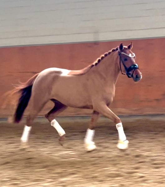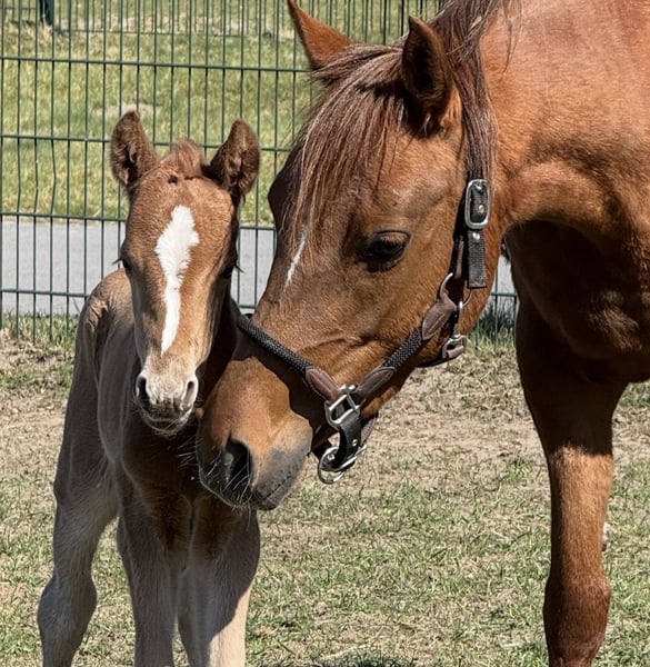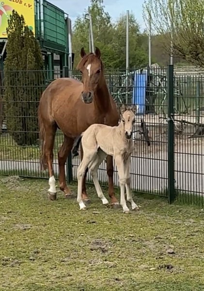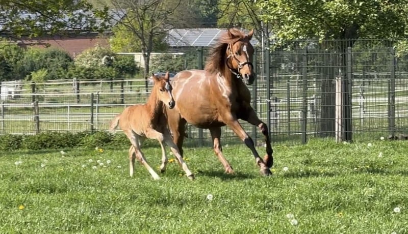 Pony Broodmare for Sale – 5 Years Old, Strong Character, Proven Breeding Record For sale is a 5-year-old pony broodmare with a very pleasant temperament and an impressive pedigree. Standing approximately 1.43 meters, she combines harmonious conformation with a calm, friendly nature—ideal qualities for breeding purposes. Pedigree: Ombri B x Pilgrim’s Red x Mozart Last year, she gave birth to a healthy foal by Dallmayar K and is currently handling another foal by Gold Garant. Both offspring impress with their gentle, approachable demeanor and age-appropriate, positive development. She is familiar with bridle, saddle, and lunging, but we have decided to focus her on breeding for now, where she has proven to be a reliable and caring mother. In daily handling, she is uncomplicated, human-oriented, child-friendly, and balanced. She reliably passes on her positive traits to her progeny. An interesting mare for breeders who value character, pedigree, and quality. She is currently registered with the Weser-Ems breeding association. If desired, she can be re-bred. X-ray images are available.