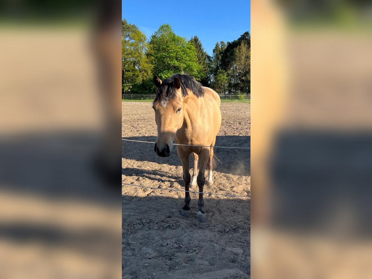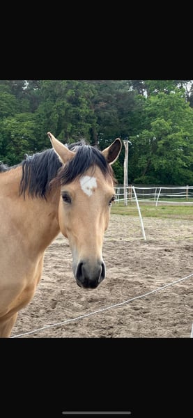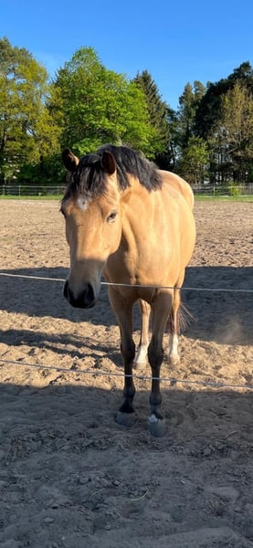 For sale is a beautiful, talented German Riding Pony mare. **Features:** - **Breed:** German Riding Pony - **Gender:** Mare - **Year of Birth:** 2021 - **Color:** Buckskin - **Height:** 14.6 hh - **Discipline:** Dressage This charming mare impresses with her friendly temperament and eagerness to learn. She is suitable for both experienced riders and ambitious beginners. Her balanced nature and quality movement make her a promising partner. We initially purchased the pony as a leisure companion for a young family, but it quickly became clear that she has much more potential: she is talented, motivated, and eager to develop – more than we can currently offer her. The mare is well-behaved in handling and trail-safe. Reining and trail riding videos are available. She tends to be higher in the herd hierarchy. AKU from April 2025 OBB available (with X-rays). If you are interested or have further questions, please contact me! Visits can be arranged by appointment. Due to reit tourism, a fee of €25 will be charged, which will be deducted from the purchase price. Phone: 0178 1856374