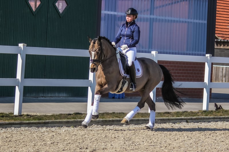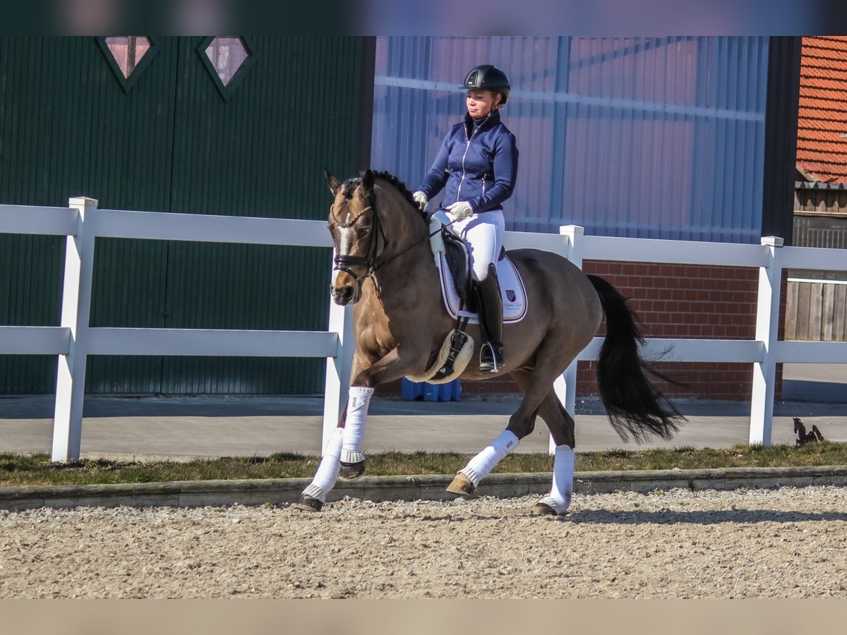 With the 6-year-old "Dance For Gold" we have a beautiful gelding in dream look to offer. In addition to its great presentation, it has three good basic gaits, as well as an absolutely great interior. In his dealings, he is super well-behaved and can not be disturbed by anything. Even small children can easily guide, clean and daddle it. "Danci" was carefully built up in the years before and was able to grow out in peace and enjoy his youth. Now he is physically grown and ready for new tasks. Due to its presentation and its frame, it also easily covers adult riders. On the paternal side and also from the mother father, "Danci" combines the best performance lines and is therefore suitable for the upscale pony sport. His father "Dance For Me" was already able to win the Hamburg Pony Derby with his rider at the age of 6. His mother father "Danny Gold" can also boast many placements up to class L and his numerous descendants are just as successful in pony sports. With appropriate funding, a great sports pony matures here. As a 3-year-old there was a very good 20 pictures Tüv available. If you are seriously interested, you are welcome to 491707941333.