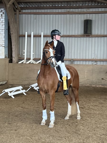 Due to a switch to full-sized horses, we are, with a heavy heart, parting with our talented pony gelding. *** Price is secondary to the well-being of the horse *** A beautifully presented Welsh riding pony gelding, boasting three very good basic gaits and a wonderful character. He has achieved wins and placings in dressage from level A (A* + A** victorious) up to L*. Unfortunately, we haven't been able to fully realize his potential due to the rapid growth of his young rider. He is always reliable in competition and a real eye-catcher. Sadly, our pony days are ending sooner than planned, and we are looking for a new 5-star home where he can help another young rider start their sport journey and bring daily joy. With his perfect size of 148 cm (measured at his lifetime height), he is well-suited for ponies but not a weight carrier. With further sporting development, he can help his future rider achieve many successes in pony sport and also be a wonderful friend and partner. He is easy and safe to handle on the ground, very comfortable in the saddle, and suitable even for less experienced riders. He also shows talent in jumping, although we have not competed him in that discipline. In daily handling, he is absolutely uncomplicated: lunging, loading, training away from home, clinics, farrier visits, regular hacks (even alone), riding without saddle or with a halter, on stubble fields... he’s up for any fun. He is housed with us in a mixed herd (on pasture during the day in summer, on paddocks in winter), has never been ill, and a very good large TÜV (health check) from 2022 is available. Only to proven, caring, and supportive hands, possibly including tack.