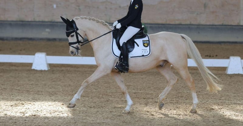 Zum Verkauf steht ein 13-jähriger Palomino-Wallach mit einem FEI Lifetime Measurement von 146 cm. Dieses außergewöhnliche Pony überzeugt nicht nur durch seine elegante Erscheinung, sondern vor allem durch seine sportlichen Erfolge. Er war von Klasse E bis FEI erfolgreich unterwegs und konnte sich auch in FEI-Prüfungen platzieren. Ein echtes Lehr- und Erfolgspony, dass seinem Reiter viel Sicherheit und Spaß im Sport vermittelt. Er verfügt über sehr gute Grundgangarten, ist rittig, leistungsbereit und kennt das Turnierleben bestens. Damit ist er für ambitionierte Reiter bestens geeignet. Ein kleiner Schönheitsfehler ist vorhanden, beeinträchtigt ihn jedoch in keiner Weise – weder gesundheitlich noch leistungsmäßig. Ein absolut ehrliches, erfahrenes und zuverlässiges Pony, das noch viele Erfolge ermöglichen kann.