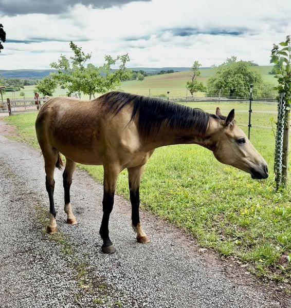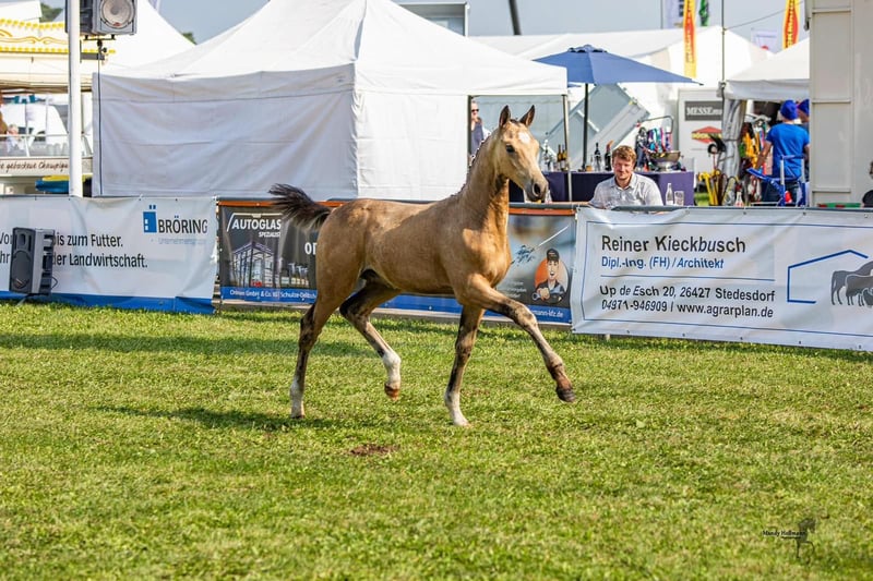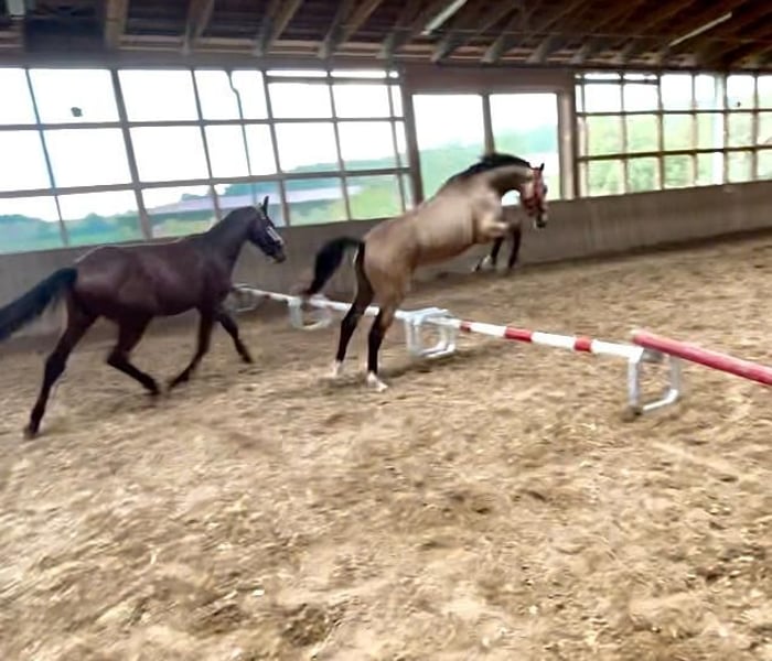 🌟 Absolute kans vanwege voorraadvermindering! 🌟 Carlson is een prachtig XL rijponyruin van Cadlanvalley Sir Ivenhoe (Welsh B Elitehengst) x Grey Top x Mont du Cantal AA, geboren in 5/2023, in de gewilde zeldzame kleur Buckskin. Op dit moment is hij met zijn 2,5 jaar 1,53 m groot. Hij valt niet alleen op door zijn hart op zijn voorhoofd, maar heeft ook een geweldig karakter. Altijd vriendelijk en welwillend naar mensen en zijn soortgenoten, zal hij in de toekomst zeker een ideaal moeder-kind-XL-pony, sportpony of vrijetijdspartner voor alle takken van de paardensport zijn. Bijzonder vermeldenswaardig is zijn springkwaliteit, die hij al bij een unieke sprong zelfverzekerd toonde. Afkomstig brengt hij deze moederszijde met het beste Hannoveraanse springbloed al mee. Door zijn goed gedragen basisgangen is hij ook geschikt voor dressuur en eventing. Carlson hebben we als veulen in 2023 gekocht en sindsdien groeit hij op een diervriendelijke manier in groepshuisvesting. We wensen een liefdevol thuis waar men zo'n stralende jongen weet te waarderen en te stimuleren. Absoluut plek voor prijs!! We verzoeken om afstand te nemen van vragen zoals "laatste prijs" en onbeschaamde prijsaanbiedingen. Hij wordt niet weggegeven, maar verkocht voor een eerlijke prijs! Vragen graag direct per telefoon!