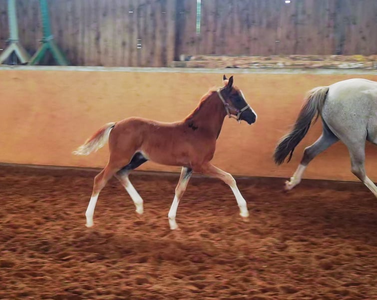 Dover's pedigree is pure performance. His sire's side contains one Bundeschampion after the other. His dam Nele has the state premium, her full brother Napoli is currently placed up to medium level in America, the granddam Santa Fee was winner at registration, winner of the IG Stutenpreis and is the full sister to the licensed winners and reserve winners Sheraton and Shalom, who are both placed up to medium level dressage and have qualified several times for the BC. Another full sister is placed up to medium dressage level and a full brother took part in the Westphalian Jumping Championships. Santa Fee's sire Santiago is a premium performance stallion and South German licensing winner, his full brothers Schiwago (also South German licensing winner successful up to advanced dressage) and Sydney HLP winner, Veronika federal premium mare and Visa. From Visa comes Deluxe (3x BC qualified and for years an integral part of the Austrian pony dressage squad. Another daughter Notre Dame is victorious in advanced level dressage in America and her full sister Normandie has the state premium and continues the Visa line in breeding, Visa's and Santiago's sire Schwalmprinz was licensing winner and federal reserve winner. His parents were the legendary Starlyte Pawlova was the best European Welsh mare in Ermelo and his sire Sarnau Showman was three times winner of the Royal Welsh Show and led the ranking of English, Dutch and Belgian sport ponies for years.