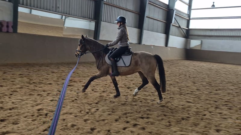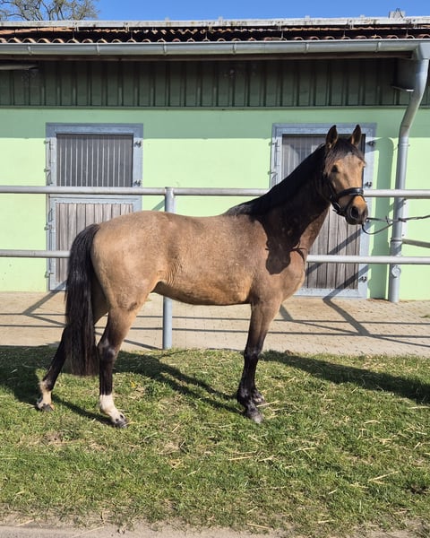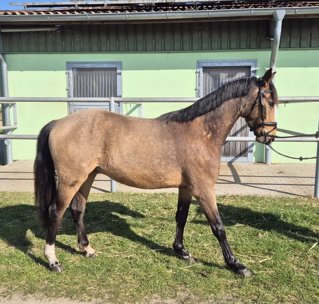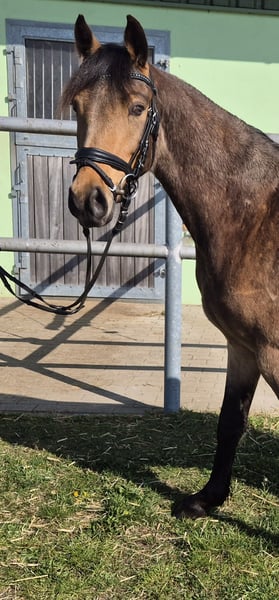 Verkaufe deutsches Reitpony – Wallach, geb. 2023, Buckskin, Stockmaß ca. 143 cm Dieser bezaubernde deutsche Reitpony-Wallach ist ein echtes Schmuckstück für alle, die ein talentiertes und charmantes Pferd suchen. Geboren im Jahr 2023, überzeugt er durch seine elegante Erscheinung und sein freundliches Wesen. Das Buckskin-Farbkleid macht ihn zu einem echten Blickfang. Er hat einen angenehmen aufgeschlossenen Charakter und ist bei mir in einer Jungpferdeherde gut aufgewachsen. Ich habe ihn als Fohlen gekauft und wollte ihn eigentlich selber ausbilden, was ich aber jetzt nicht mehr leisten kann. Sein Vater Tackmann´s Cantuccini erfolgreich bis Klasse S stammt vom berühmten FS Chambertin ab. Er bringt sehr geschmeidige und raumgreifende Bewegungen mit, daher sehe ich ihn als potenzielles Dressurpony. Crümel wird zur Zeit angeritten dabei zeigt er sich von seiner allerbesten Seite und nimmt die neuen Eindrücke sehr aufmerksam und willig auf. Bei Interesse oder weiteren Fragen stehe ich gerne zur Verfügung. Eine Besichtigung ist nach Absprache möglich.