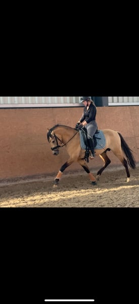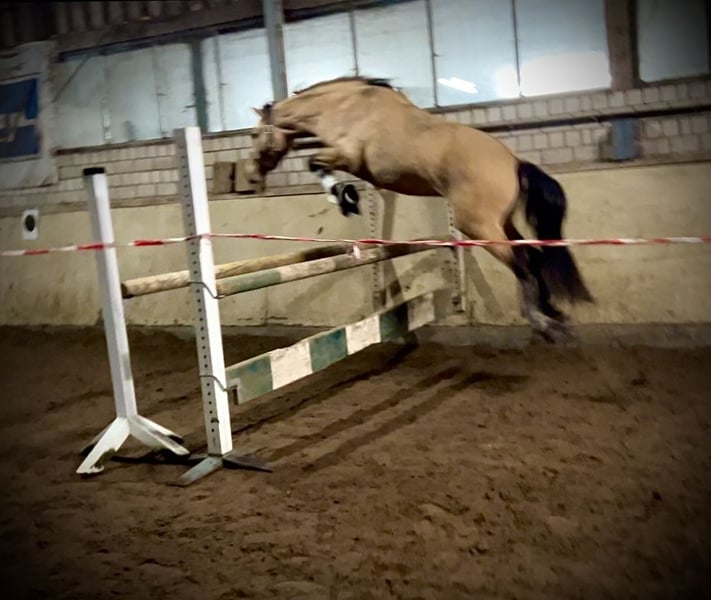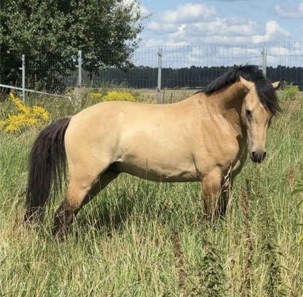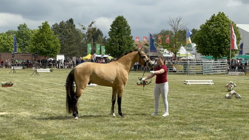 Dieses wunderschöne Pony in edler Falbjacke (aktuell 1,45 m, noch im Wachstum!) sucht nun seinen passenden Möhrchengeber. Ein echter Schatz – sozial, brav und unglaublich menschenbezogen. Schon als Fohlen wusste er zu überzeugen: Sieger des Fohlenchampionats, ausgestattet mit drei guten Grundgangarten und einem harmonischen, elastischen Bewegungsablauf. Er wurde von einer 14-jährigen Reiterin mit angeritten und zeigt sich dabei stets motiviert, aufmerksam und immer bemüht, alles richtig zu machen. Auch auswärts im Training war er bereits und hat sich dort von seiner besten Seite gezeigt – brav, unkompliziert und neugierig bei allem Neuen. Selbstverständlich ist er schmied- und verladefromm und zeigt sich auch im täglichen Umgang absolut unkompliziert. Mit weiterer Förderung wird er sicher ein tolles Kinder- oder Jugendpony – und später vielleicht auch ein spannendes Nachwuchspony für die FEI-Tour. Seine gute Sprungmanier lässt zudem vermuten, dass er sich auch hervorragend als Hunter- oder vielseitiges Reitpony entwickeln könnte. Er liebt die Bodenarbeit, probiert begeistert Neues aus und sucht immer die Nähe zum Menschen. Anfangs etwas vorsichtig, taut er sehr schnell auf und schenkt seinem Menschen dann sein ganzes Vertrauen.