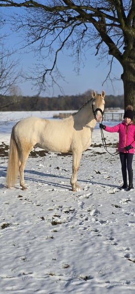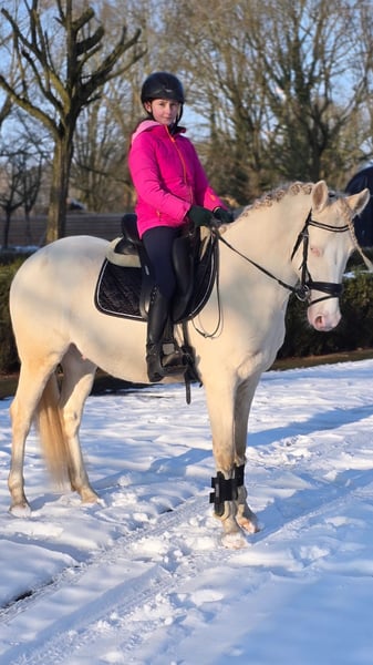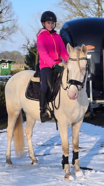 Glücksmoment is a beautiful 4-year-old pony gelding with an excellent temperament. He is always eager to do his best and shows great willingness to learn. The pony has been ridden by a 10-year-old girl and is regularly in training. Suitable for riders at a solid E-level. Glücksmoment goes out to the paddock daily with other horses and is social and easy to handle. This pony brings great joy in daily work. If you are interested in our pony, I look forward to hearing from you by phone.