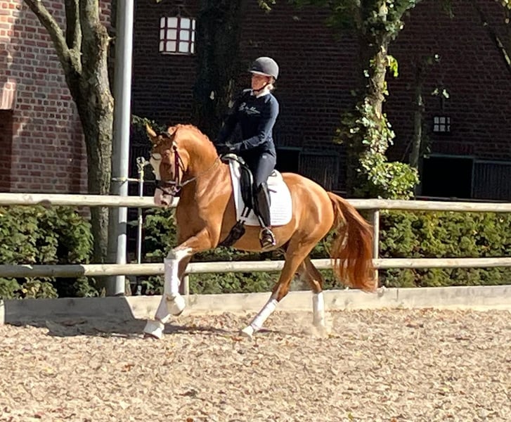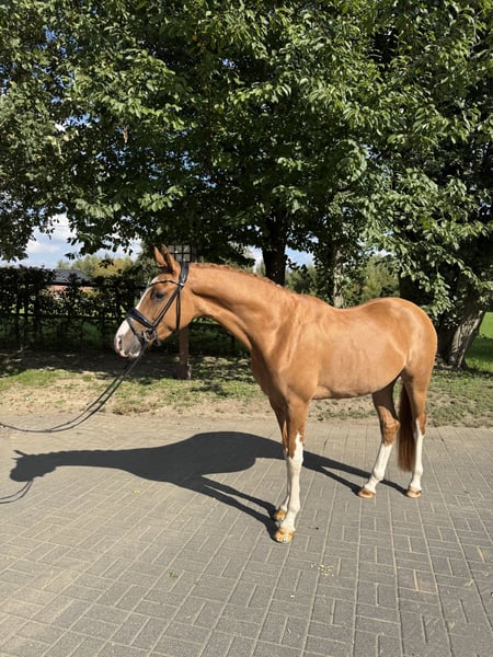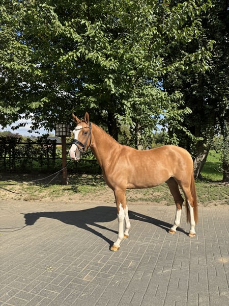 For sale is this very colorful and beautiful chestnut gelding. He is an exceptionally typy and elegant XL pony, with a top conformation. The charming young horse impresses with a positive attitude and three very good basic gaits. Carefully and age-appropriately trained, he combines excellent fundamental quality, great rideability, and an engaging personality – a pony that delights both experienced amateurs and ambitious competitive riders. In daily handling, he is very gentle, friendly, and affectionate. A video can be sent via WhatsApp.