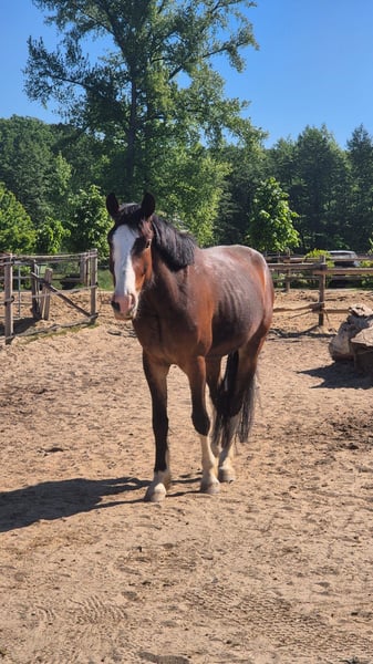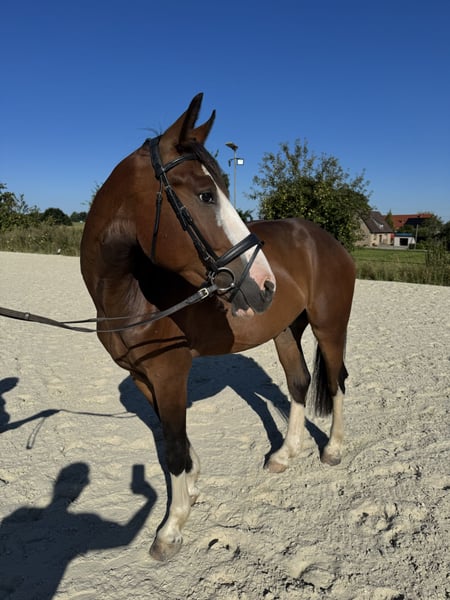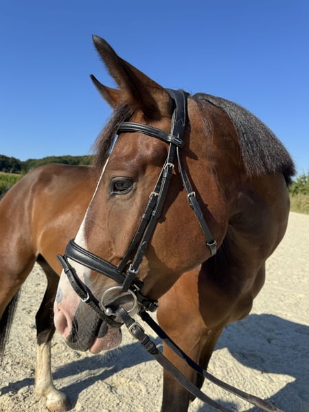 Ludwig is a 4-year-old gelding who has been gently backed this year. He was born with us and has grown up in a herd environment. Ludwig is absolutely uncomplicated, gets along with everyone, and is always friendly. He is familiar with both box and pasture housing. In his training, he knows groundwork, walks, long-lining, and free jumping. He is very sweet to handle and can also be groomed and led by children. He is ridden both in the indoor arena and in a large outdoor arena. He is already doing very well with his first jumps under the rider. Here he shows himself to be completely unflappable and jumps both natural obstacles as well as planks and colorful poles. He learns quickly and is always attentive. With his size, he is suitable for petite adults, children, and teenagers. Ludwig is very people-oriented and loves to be cared for. He is regularly dewormed, good with the farrier, and well-behaved for loading. He is now looking for a new home where he can continue to be developed and learn many new things. I can also imagine him well in eventing. If you have any further questions, please feel free to contact me.