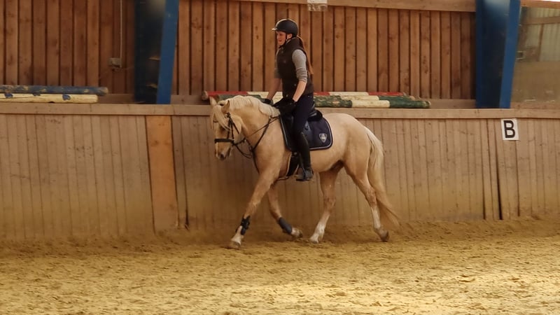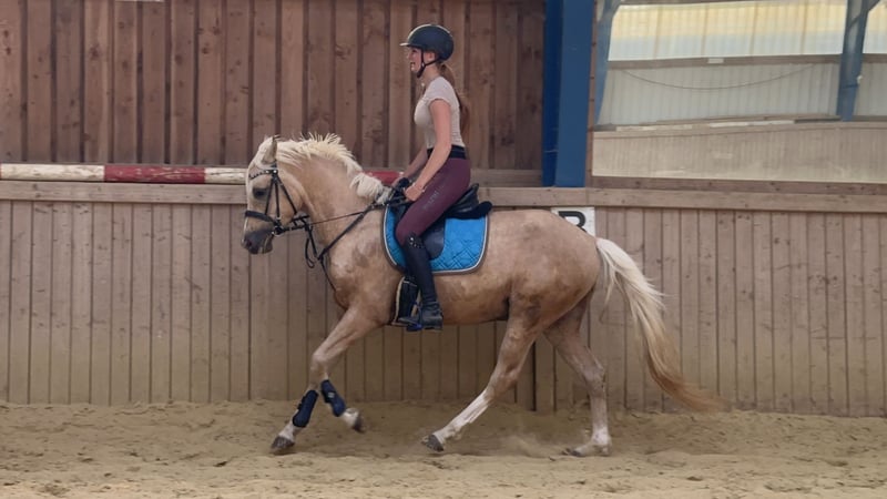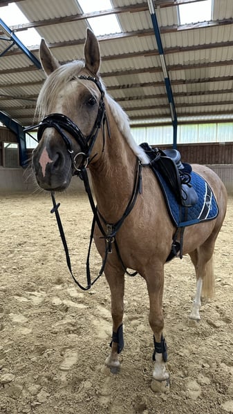 Schweren Herzens steht hier mein sensibler, traumhafter Palominowallach mit sehr guter Veranlagung und feinem Charakter zum Verkauf. Deutsches Reitpony XL Wallach geb.2019 volles Papier ca.152 cm barhuf gesund Zähne gemacht komplett geimpft Tetanus, Influenza, Herpes bildschön brav im Umgang und total verschmust anhänglich und sensibel robust und artgerecht mit gleichaltrigen aufgewachsen kennt 24/7 Weide/Offenstall und Paddockbox mit täglichen Weidegang absolut verträglich mit allem sehr gute GGA, viel Qualität sehr fein macht auch einen tollen Sprung Mai 2024 angeritten, dann nochmal Sommerpause gemacht und wird seit Okt.2024 drei Mal pro Woche geritten muss alters-und ausbildungsentsprechend noch gefördert werden, braucht sicheren Reiter noch kein Kinder-/Anfängerpferd Verkauf nur an Privat in absolut gute fördernde Hände mit artgerechter Haltung. Ich verschicke keine unzähligen Bilder und Videos an Sammler! Wer wirklich Interesse hat kann gerne vorbei komme und sich dieses tolle Pony live ansehen. Probereiten nach Vereinbarung 35 Euro, werden beim Kauf verrechnet.