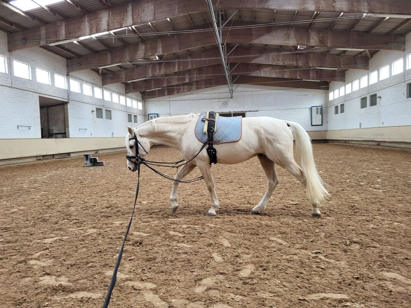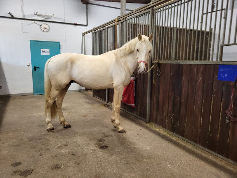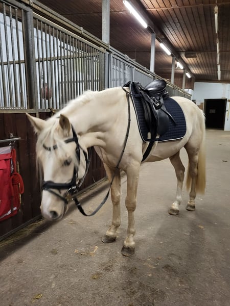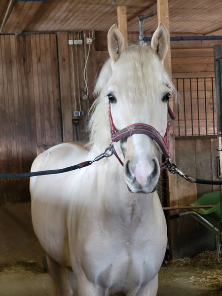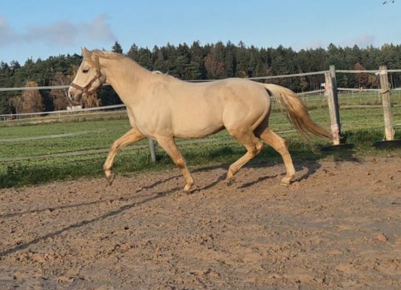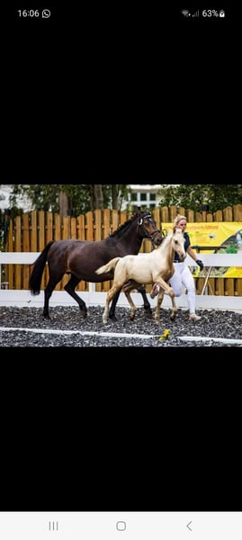 I am unfortunately selling my young stallion stallion because I have to give up equestrian sport due to a knee injury. This gelding impresses not only with his impressive movement combined with looseness but also with his wonderful temperament! Since he has been in my possession, he has never bitten, nipped, or kicked; he is always gentle and not cheeky, even around small children. He enjoys every pet and loves cuddling! His gait is above average, with a relaxed body, powerful push-off, and very expressive movement! When playing with other geldings, it was easy to see that he can sit properly and has a good potential for collection. He also performs well in free jumping and always tries to do everything correctly, although he lacks routine because I hardly have the opportunity to ride him due to my knee injury. He can also be exercised alone or in a group on walks; he remains relaxed when left alone in the paddock or paddock box/stall. He is familiar with both housing systems. He has a very relaxed nature with the necessary energy. He is always well-behaved at the farrier, and the few times we loaded him, he was calm whether alone or with a second horse. He is truly a dream! About a year ago, I sat on him three times and even rode him a short distance in walk; he handled it bravely. I wanted to give him a winter break and continue his training afterward. Unfortunately, I injured my knee badly during that time, and the healing did not go as planned, so he has not been under saddle for a year. Therefore, he is sold strictly as a project horse! He has a small blemish above his eye, which is why I am offering him at a lower price. However, this is only a cosmetic issue and has never bothered him or me; he had it when I bought him. According to the vet, it could be removed if sedated, for example, during a dental check. As I said, neither he nor I have been bothered by it. He is an XXL pony, approximately 153 cm tall, making him suitable for adult riders as well. I wish for someone who will love him dearly and prioritize his well-being! The last photos show his sire and dam. The price is negotiable, as long as it is fair. Please feel free to contact me for further questions.