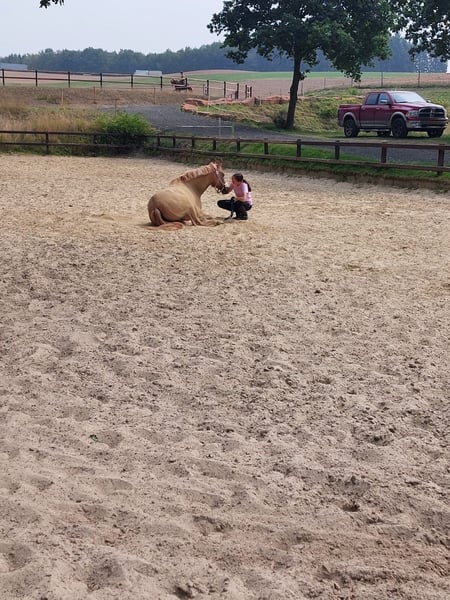 Hallo ich bin Lisa, 18 Jahre alt und mache aktuell mein Abitur. Da ich mir ziemlich sicher bin, dass ich während meines darauffolgenden Studiums sehr viel weniger Zeit für mein Pferd habe, suche ich jemanden der sich gerne ca. 3 Tage die Woche um Teddy kümmern möchte. Teddy ist 1.53m groß und wird dieses Jahr 8 Jahre alt. Ich mache so ziemlich alles mit ihm. Dressur, Springen, Ausreiten, Spazieren, Longe/Doppellonge, Bodenarbeit. Mit Sattel oder ohne, er kennt alles. Ich habe ihn auch schon erfolgreich auf Turnier vorgestellt und bin regelmäßig auf Lehrgängen. Er ist teilweise etwas schreckhaft, da muss man aber ruhig bleiben und ihm das Gefühl vermitteln, dass alles gut ist. Beim Reiten kann er es absolut nicht leiden wenn man zu arg mit der Hand herangeht. Gewicht- und Schenkelhilfen sind hier wichtig. Ich bin ihn am Anfang ganz viel mit Ausbindern geritten, da er dann zufrieden ist und man eigentlich nur draufsitzen muss. Daher ist er auch für Kids oder weniger starke Reiter gedacht. Eben immer dann wenn man ihn Vorne mehr oder weniger in Ruhe lässt. Wenn Kinder um ihn herum sind steht er immer brav hin und lässt sich betütteln. Da ist er dann plötzlich ganz Nervenstark. Wir stehen an einem schönen Stall in Baltmannsweiler. Es steht keinerlei Stallarbeit an, höchstens mal ein in Koppelreinholdienst. Wir haben diverse Trainer am Stall, da kann man dann schauen mit wem man am besten klar kommt. Ansonsten kann man mit Absprache der Stallbesitzer auch externe Trainer mitbringen. Meine Hoffnung wäre eigentlich, dass sich ein Eltern/Trainer/Kind-Gespann finden würde, welches ihn einfach lieb hat und ihn einfach herzlich in alles integriert. Ob das nun die Bodenarbeit, Ausreiten, kleine Turniere (Reiter-WB, Springreiter-WB) oder einfach Dressurlich ohne viel Druck ist. Aber meldet euch gerne und wir schauen ob es passt, denn wichtig ist dass jemand kommt der ihn nicht als Sportobjekt sieht und einfach mit ihm in seinem Tempo und auf seine Art arbeiten möchte. Falls Interesse besteht oder irgendwelche Fragen offen sind, bitte fragt! Ich würde mich sehr freuen euch kennenzulernen! Preis ist für 3 Tage gerechnet. Das kann ich anpassen je nachdem wie viele Tage gewünscht sind.