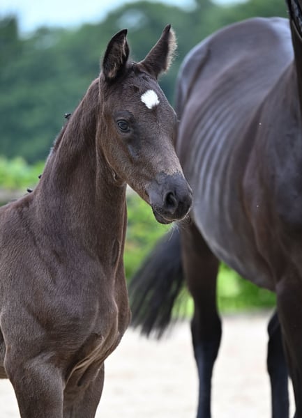 Escanero Del Solei is a very human-oriented, beautifully handsome colt with a dark coat, born in May 2025. He shows great interest in new situations and is absolutely not spooky. He is quick to learn and enjoys practicing the foal ABCs. He is halter-trained, loading well, and he also accepts being sprayed with water and giving his hooves wonderfully. He is accustomed to children, cars, tractors, and dogs. His pedigree is an outstanding dressage mix from internationally successful ancestors. His maternal grandsire is the well-known Danciano, who himself conquered the Grand Prix stage from the line of Escanto PS Old, holding the title of Bundeschampion for 4-year-olds in his bloodline. His sire, Escanto PS Old, stands at 169 cm and has a promising pedigree with Escamillo and Fürstenball in his lineage. The judges awarded a score of 10 at the Bundeschampion for the "very, very expressive trot with good relaxation, clearly light-footed, with an absolutely positive basic tension and completely balanced even in all turns." He also received a 10 for his canter and rideability. Overall, he is a two-time record winner of the stallion performance test. The stallion, born in 2019, has as a sire the renowned Escamillo, who has already won silver and bronze at the Dressage Horse World Championships. Escanero's watchful, curious eyes reflect a high intelligence. His neck is beautifully long with a nicely curved neck arch. Due to his large, sloping shoulder, Escanero Del Solei already exhibits expansive movements, which were rated 8.5 at the foal show. His canter is expressive, with an upward tendency, and he powers from the hindquarters, clearly demonstrated while playing in the pasture. In his trot, he glides rhythmically over the ground, just like his father. His high withers, transitioning into a long back, indicate that the horse can carry its rider and saddle well. Escanero Del Solei's conformation impressed with an elegant foundation, scoring 8 points. His expansive canter was rated 8.5 at just 6 weeks old. His overall impression in behavior and future perspective was rated 9 out of 10. His type was also noted with a very good 9.0. Overall, he achieved a very joyful result of 43.0 points as a premium foal at the foal show on June 16. Currently, he is growing up with a second foal in a herd environment. He will be available for sale no earlier than 6 months. He can be viewed in Munich. We look forward to a personal message.