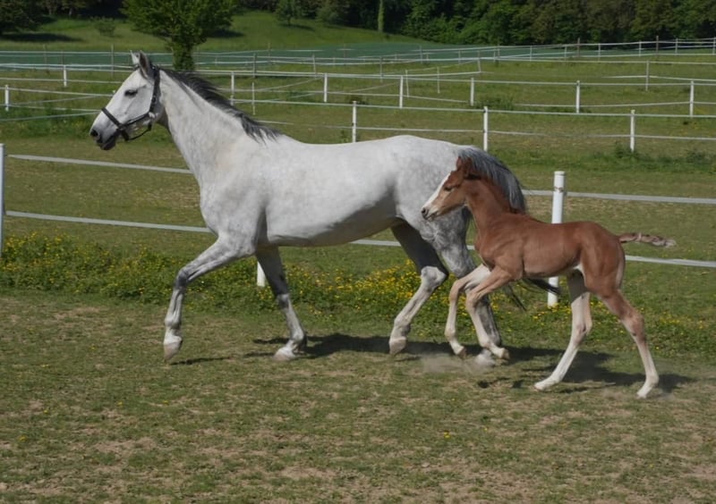 Due to stock reduction, mare and foal are for sale as a pair or individually. Foal born on 01.05.2025 Mother born on 19.05.2015 (currently has her 4th foal) Maternal Grandmother: 1 successful offspring by Conthargos SPR S, 1 successful offspring by Heops/T. SPR M Maternal Great-Grandmother: several M and S show jumping horses, 1 offspring in dressage M