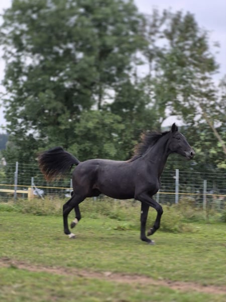 Zum Verkauf steht ein schick aufgemachter Junghengst. Colorado ist am 10.05 2024 geboren und hat jetzt schon eine Größe von 168 cm. Vater Comme Prévu - Prämienhengst, platziert beim Bundeschampionat und den Weltmeisterschaften, Hauptprämiensieger und siegreich in der Klasse S. Sein Vater Comme il faut gewann 2016 mit Marcus Ehning das Weltcupspringen in Madrid, den Großen Preis von Wien (1,60m) wie auch 2017 den Großen Preis von Paderborn (1,50m). Mehrfach war er international hoch platziert (Oslo 1,60m; Helsinki Großer Preis 1,55m; Weltcup-Qualifikation London 1,55m). 2015 wurde er Zweiter im Nationenpreis und zweimal Dritter in internationalen Springen über 1,60 m (Rom, Rotterdam). 2018 siegte er u.a. im Großen Preis von Brüssel (1,55m) sowie in der GCL-Etappe von Chantilly (1,55m) und gehörte zum deutschen Championatskader. 2018 stellte er den Bundeschampion der 5-jährigen Springpferde Chao Lee sowie die Vize Bundeschampioness bei den 6-jährigen, Daddys Destiny. Comme il faut's Vater Cornet Obolensky (Marco Kutscher/GER) gewann Große Preise und Nationenpreise und ist einer der erfolgreichsten Vererber der Gegenwart. Comme il faut's Mutter Ratina Z war das Erfolgspferd von Ludger Beerbaum. Colorados Mutter stammt ab vom Hengst Antaeus“ dieser war Drittplatzierter der Hengstleistungsprüfung in Neustadt/Dosse 1998, wobei er sowohl im Springen als auch für seine Leistungsbereitschaft und Konstitution jeweils die Maximalnote 10,0 erhielt. Sein Vater „Acord II“ gilt als einer der besten Springvererber der jüngeren Generation. Die Mutter „Arabesque“ entstammt einer ganz vornehmen hannoverschen Leistungsfamilie: sie ist nicht nur Vollschwester des „Aramis“, (Weltcupsiegers 1982 unter Mario Deslauriers, Kanada), sondern auch Schwester des gekörten Hengstes und vielfachen S-Siegers „Amani“ und der Bundessiegerstute „Arabella“. Auch die in S-Springen erfolgreichen Stuten „Adelane“ und „Anatevka 40“ sind Vollgeschwister der Argentan-Tochter „Arabesque“. „Anmut, eine weitere Vertreterin dieser Erfolgsdynastie, brachte den erfolgreichen Nachwuchsvererber „Last Liberty“. Großmutter „Elfenfee“ muss auf Grund des schon fast sagenhaften Passereffekts zum Hengst „Argentan I“ als eine der erfolgreichsten Stuten in der Geschichte des hannoverschen Pferdes angesehen werden. Bestes Springblut vereint