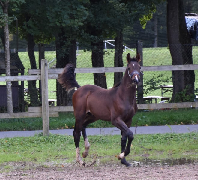Stylish colt in dark jacket, son of Jack Blue - known from this year's Bundeschampionat ❤️ Elwood has very good basic gaits, possesses a harmonious exterior with a good top line and straight back. Character-wise: curious, quick to learn, cheeky but always a nice guy. A future athlete :-)
