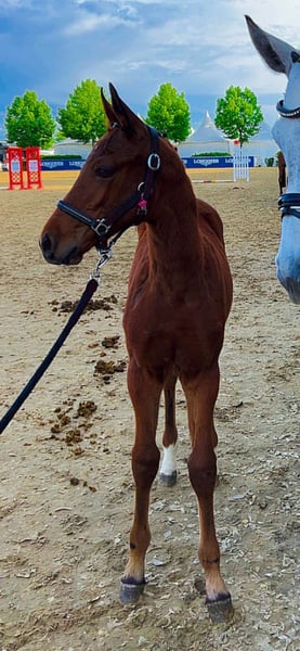 Upsala is a stunning, tall and elegant colt by Unstoppable de la Pomme x Cornet Obolensky. He is very well-behaved in daily handling and with the farrier, always eager to please. He has a correct conformation and three excellent gaits. Sire Unstoppable de la Pomme is an exceptional young sire, promising a bright international showjumping career. A true athlete of the finest kind—expressive, ambitious, brave and powerful, ideally suited for modern top-level sport. His pedigree confirms this quality at the highest level: his sire Udarco van Overis successfully competed up to 1.60 m with German rider Sarah Nagel-Tornau. His dam, Gazelle de la Pomme, competed up to 1.35 m and descends from the world-renowned Belgian breeder Joris de Brabander (Stal de Muze). She is a 75% sister to the famous stallion Vagabond de la Pomme (Pénélope Leprevost, FRA). In his first show season, Unstoppable de la Pomme impressed with multiple wins and top placings. During his 14-day performance test, he earned several scores of 9.0, particularly for jumping ability and willingness to perform. His first foal crop shows strong type, good movement, and growth potential. This de Muze line is considered Belgium’s most successful damline, producing numerous 1.60 m Grand Prix horses. Maternal lineage • 1st generation: Holst. line 1086 • 3rd generation: approved stallions, e.g. Dicontendro (USA 2016) by Diarado • 4th–5th generations: many successful international showjumpers up to 1.60 m, including Chablis 105, Curiboh, FBW Coulthard, Tshakira 2, Captain Jack E, Chocolate E, Contact You, Charming Scarlett E, and others. *The passport has been requested and is still being processed by the studbook, please take possible delays into account.