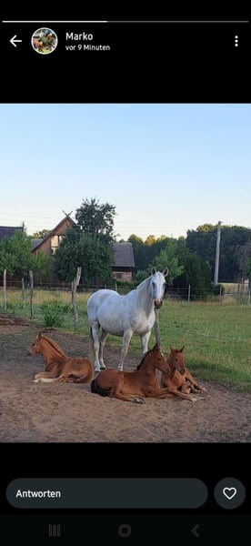 Zum Verkauf steht meine 172cm große Schimmelstute. Kapriola ist selbst sporterfolgreich und ihre ältesten Nachkommen sind auch bereits im M/S Bereich angelangt. Die Fohlen, die sie bei mir bekommen hat, wurden ausnahmslos prämiert. Sie nimmt immer gut auf ( auch mit Fohlen bei Fuß) und ist vom ganzen Handling absolut unkompliziert. Auf Grund eines Fesselträgerschadens und damit verbundenen Taktunreinheiten soll sie nicht mehr geritten werden , sondern wird ausschließlich als Zuchtstute oder Beisteller abgegeben. Hierbei gilt absolut Platz vor Preis. Standort : 03096 Burg Preis : 1500 VB Kontakt: 01724967065