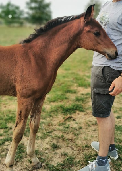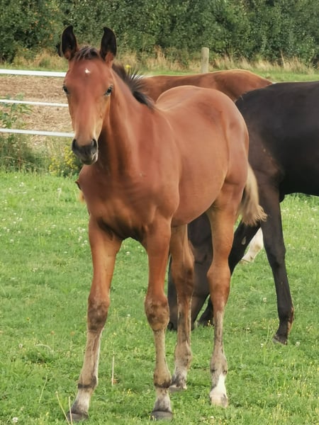Chance zum selber ausbilden! Ich verkaufe schweren Herzens und nur aufgrund notwendiger Bestandsreduzierung meine 2 1/2 jährige Stute aus eigener Zucht. Dahlia Queen stammt ab von Decurio aus einer Lazio x Quattro B x Grandeur Mutter. Somit sollte sie beste Doppelveranlagung haben. Mit aktuell ca. 1,60m Stockmaß wird sie sicher ein tolles Damenreitpferd. Dahlia ist bei mir geboren und lebt von Anfang an im Offenstall im Herdenverband. Sie ist sozial und sehr verträglich mit allen Pferden die sie bisher kennengelernt hat. Sie spielt gerne, daher kann sie mal die ein oder andere Schramme haben, war allerdings bei mir nie krank. Dahlia ist absolut menschenbezogen, liebt jede Form von Aufmerksamkeit. Selbstverständlich kennt sie auch den Schmied und ist halfterführig. Ihren ersten Ausflug in die Halle hat sie souverän gemeistert. Generell ist sie eher selbstbewusst und nicht sehr ängstlich. Alles in allem ist Dahlia ein tolles Pferd, mit der ein ambitionierter Reiter sicher seine Freude hat! Natürlich kann sie gerne angeschaut und kennengelernt werden! Weitere Fragen beantworte ich gerne. Evtl. könnte sie über den Winter hier noch stehen bleiben