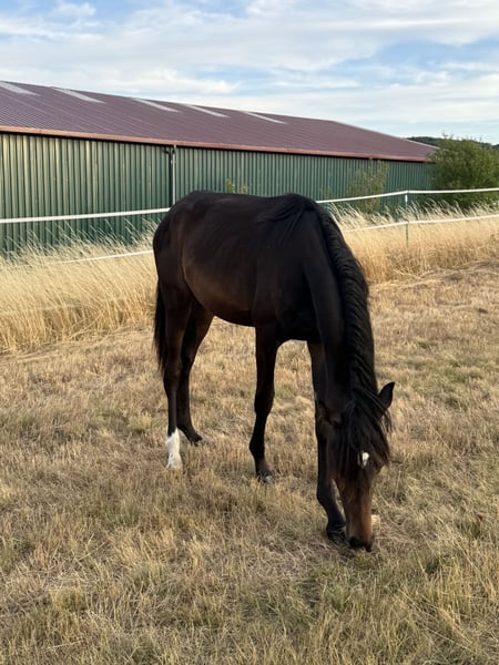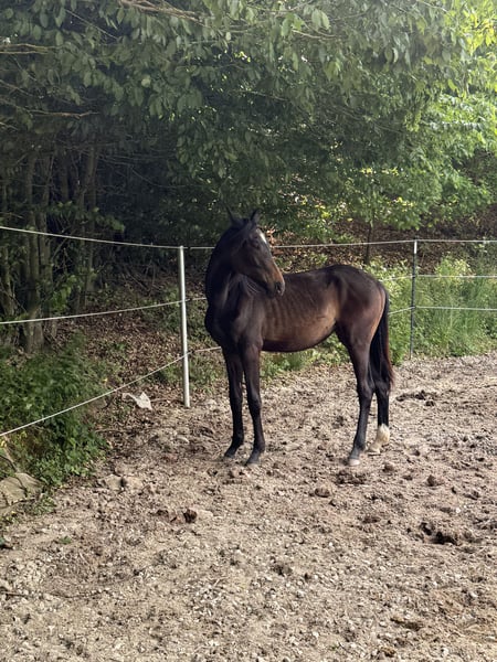 Vente d'une jument née le 23 avril 2024. Cette élégante beauté baie foncée mesure actuellement 1,65 m au garrot. Idéale pour les cavaliers à la recherche d’un jeune cheval pour le dressage. Elle connaît l’alphabet du poulain et possède une grande capacité d’apprentissage, ce qui en fait une partenaire prometteuse pour de futurs succès. Malheureusement, en raison d’un ulcère gastrique, actuellement en traitement, elle a commencé à faire des copings. Pour toute question ou information complémentaire, je reste à votre disposition. Ne manquez pas cette opportunité et prenez rendez-vous pour la voir !