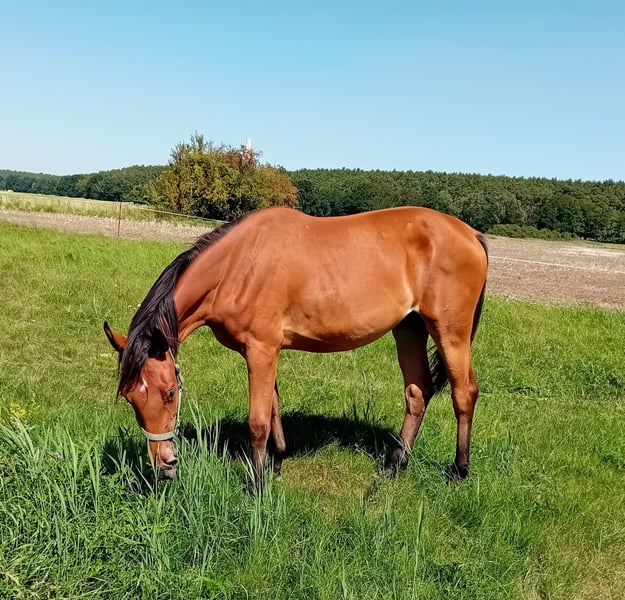 This charming yearling mare (born March 2024) moves with ease and lightness. "Cara" grew up in a small mixed herd of young horses, is very friendly, and has mastered the basics of foal training. She presents herself elegantly and sportily, and her pedigree provides excellent foundational qualities for high-level show jumping. Her sire, CHALOUBINO PS, is a two-time vice-champion of the German Federal Championships and Oldenburg State Champion. He has demonstrated his jumping potential particularly under rider Patrick Stühlmeyer in Lanaken, Belgium, competing in 1.50 m classes. At just 8 years old, CHALOUBINO PS placed second in the "Sire of the World" show jumping competition. His performance strength is also evident in his first foal crops, sired by the renowned, recently sadly deceased CHACOON BLUE. "Cara" is a promising, typy young horse, also backed by performance on her dam’s side. Her dam is by DIAMANT DE PLAISIR I (by DIAMANT DE SEMILLY). At five years old, she was gently started under saddle and is already performing small jumps, showing great talent. "Cara’s" granddam comes from the legendary Landgraf line and was successful in amateur competitions up to 1.35 m. She was awarded the DSP Premium for her sporting achievements. If you are interested or would like more information, I look forward to hearing from you.