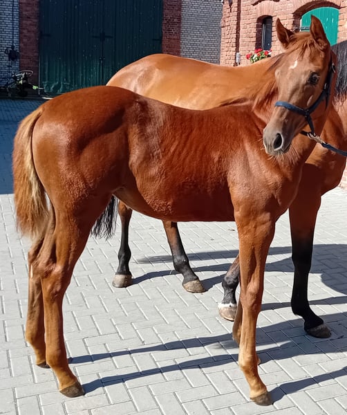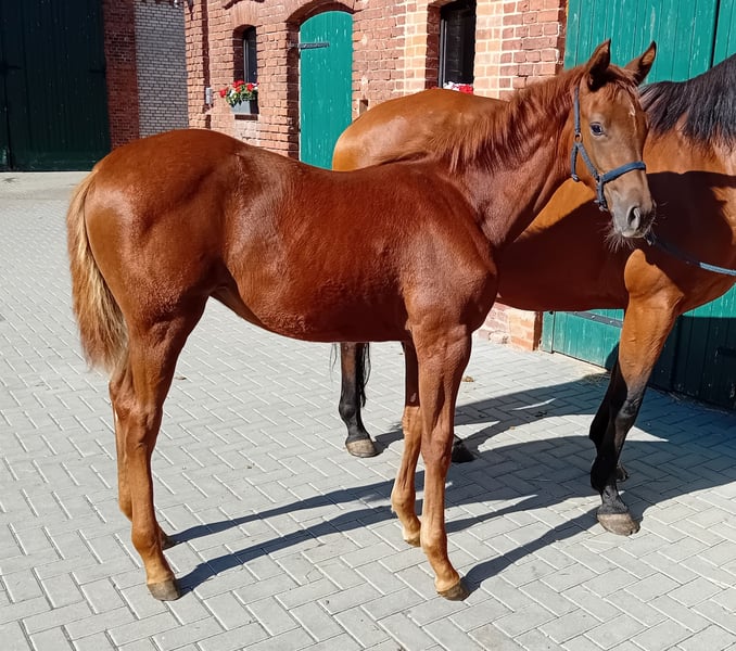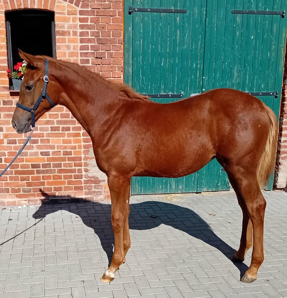 Na sprzedaż jest elegancka klaczka po Comanchero (po Comme Prèvu - trzy czwarte brata Comilfo Plus (Christian Ahlmann)) od klaczy półkrwi Chap I (po Cellestial), która jest luźna i lekka w ruchu. Młoda dama zachwyca nie tylko olśniewającym wyglądem w wyjątkowo szykownej ciemnokasztanowatej kurtce, ale także urokiem i sympatycznym charakterem. Ogier Comanchero, który otrzymał licencję podczas Oldenburg Stallion Days 2021, prezentuje się z doskonałym przeglądem, nieskończonymi możliwościami i pełną mocą. Pokonywanie terenu w kłusie i szykowny typ czynią go absolutnie przyciągającym wzrok. W połączeniu z najlepszą jezdnością i postawą, jest wielką nadzieją na ciężkie skoki w Hof Sosath. W swoim pierwszym roku pokazowym Comanchero wygrał test rozgrzewkowy przed mistrzostwami dla czteroletnich skoczków w Rastede z oceną 8,6 i znalazł się w finale swojego pierwszego testu skoczków w klasie podstawowej. Zdał krótki test predyspozycji w Vechta jako najlepszy czteroletni ogier z ogólną oceną 8,44. W 2023 roku Comanchero zakwalifikował się do Bundeschampionatu i znalazł się w testach dla młodych skoczków do poziomu średniego (M). W tym roku Comanchero był w stanie wykorzystać zeszłoroczne sukcesy i już kilka razy zajął wysokie miejsca w testach na poziomie średnim (M) dla młodych skoczków z wynikami do 8,7. Zakwalifikował się również do Bundeschampionatu dla sześcioletnich skoczków w Westergellersen. Więcej informacji na temat reproduktora można znaleźć na stronie: https://sosath.com/de/hengste/detail/comanchero Najstarszy potomek matki startował już z powodzeniem w klasach młodzieży do 1,35 m i został sprzedany do USA. Matka Calea przekazuje swojemu potomstwu umiejętności i bardzo dobrą technikę skoku, a także wyjątkowy styl. Odnosząca sukcesy klacz Chakaria (zwyciężczyni Rolex Grand Prix w Akwizgranie w 2024 r.) po mistrzu Europy André Thieme również ma za ojca Chap I. Aby uzyskać więcej informacji lub umówić się na oglądanie, prosimy o kontakt.