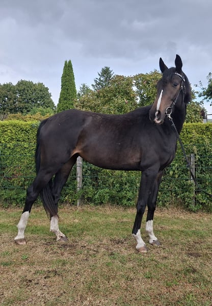 Typvolle 3-jährige DSP-Stute von Belantis II – Prämienfohlen, angeritten, brav im Umgang Zum Verkauf steht eine sehr elegante und moderne 3-jährige Deutsche Sportpferd Stute mit hervorragender Abstammung (Belantis II x Estobar NRW). Die Stute wurde als Fohlen prämiert und überzeugt durch ihre Qualität, ihren korrekten Körperbau sowie ihre überdurchschnittlichen Grundgangarten. Sie ist bereits schonend angeritten, läuft sicher unter dem Reiter und wurde auch im Gelände geritten. Dabei zeigt sie sich stets brav, unkompliziert und lernwillig. Sie ist verladefromm, kennt den Hufschmied, ist regelmäßig geimpft und gibt artig alle vier Hufe. Im täglichen Umgang ist sie sehr menschenbezogen, verschmust und absolut freundlich – kein Beißen oder Treten. Mit einem derzeitigem Stockmaß von ca. 1,67 m bringt sie ideale Voraussetzungen für den Dressursport mit. Sie ist aktuell hinten überbaut mit 1,70m und befindet sich noch im Wachstum. Geschätztes Endmaß ca 175/178. Ein tolles Nachwuchspferd für ambitionierte Reiter oder zur weiteren Ausbildung im gehobenen Dressurbereich. Preis: 13.900 € VB Nur in fördernde Hände abzugeben. Die Abgabe erfolgt aus gesundheitlichen Gründen der Besitzerin. Es ist kein Notverkauf! Für das Probereiten fällt eine Reitgebühr von 30€ an, welcher mit dem Kaufpreis bei Kauf verrechnet wird.