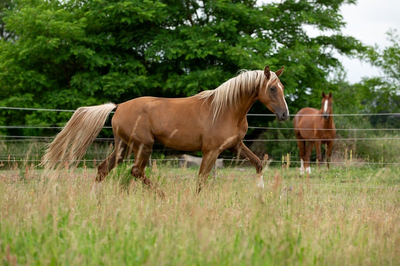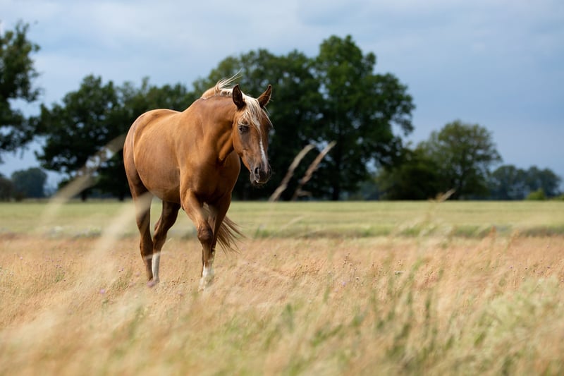 Carrie Forbes, affectionately known as "Furby," combines an excellent movement scope with an absolutely stunning dark palomino color. She was born on our farm, grew up robustly in a mixed-age herd, and is now gradually ready for further challenges. Her sire, Belvedere, a son of Belissimo, achieved a top-ten placement at the World Championships for Young Dressage Horses with Stefanie Wolf and later moved to the USA, where he is trained by Nick Wagman. Wagman considers him a potential candidate for the 2028 Olympic Games in his home country. Furby's dam, Cortess, produced numerous champion foal candidates, including the state premium mare Calamity Jane v. Bonds, who placed 4th in the dressage-oriented foal class at the German Foal Championship in Lienen and qualified for the Bundeschampionat at three years old. Furby is an alert, ambitious horse with a strong sporting drive, which is why we hope to place her in competent, supportive hands. She is also highly interesting for breeding, as she passes on her lightening cream gene 50% of the time, thus enabling the breeding of Palominos and Buckskins.