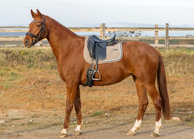 German Sport Horse Mare for Sale – Elegant Chestnut For sale is a beautiful German sport horse mare, born in 2020. With her striking chestnut coat and a height of 16.1 hh, she is a true eye-catcher both visually and in the sport. She is ideally suited for dressage and demonstrates plenty of talent along with a promising basic education. The mare is friendly, attentive, and well-ridden, making her an excellent partner for ambitious riders. Please feel free to contact me for more information or to arrange a personal impression!