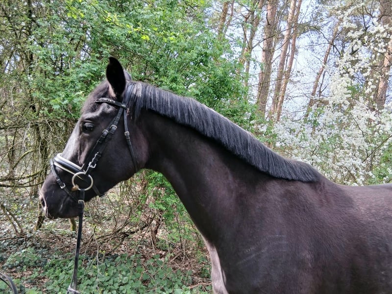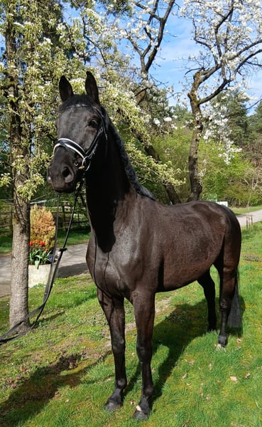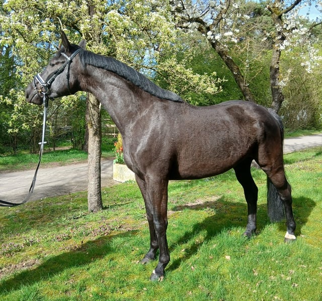 Diese wunderschöne schwarze Stute mit einer feinen weißen Schnippe ist ein echter Blickfang und überzeugt nicht nur durch ihre Ausstrahlung, sondern auch durch ihren tollen Charakter. Direkt vom Züchter und bei uns liebevoll aufgewachsen, kennt sie eine solide Grundausbildung und zeigt sich stets brav, ausgeglichen und jederzeit umgänglich. Sie ist eine echte „Damenstute“, die ihrem Reiter Sicherheit vermittelt und dabei immer motiviert und lernbereit bleibt. Auch im täglichen Handling überzeugt sie auf ganzer Linie: Sie lässt sich problemlos verladen und ist in jeder Situation zuverlässig und unkompliziert. Besonders hervorzuheben ist ihre erstklassige Abstammung: Ihre Schwester ist bereits hoch erfolgreich im Dressursport unterwegs – beste Voraussetzungen also für eine vielversprechende Zukunft. Diese Stute vereint Qualität, Rittigkeit und Verlässlichkeit – ideal sowohl für ambitionierte Freizeitreiter als auch für den Einstieg in den Sport. Auf einen Blick: • Schwarze Stute mit hübscher weißer Schnippe • Direkt vom Züchter – bei uns aufgewachsen • Top Abstammung mit erfolgreicher Dressurverwandtschaft • Sehr brav im Umgang und unter dem Sattel • Rittig, fein an den Hilfen und lernwillig • Vermittelt Sicherheit – ideal auch für Damen • Jederzeit umgänglich und unkompliziert • Verladefromm und zuverlässig • Ausgeglichenes, freundliches Wesen • Vielversprechend für Sport und Freizeit Preis zzgl. gesetzlicher Mehrwertsteuer!