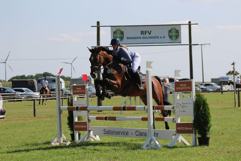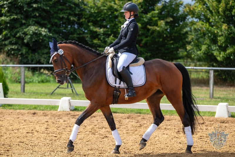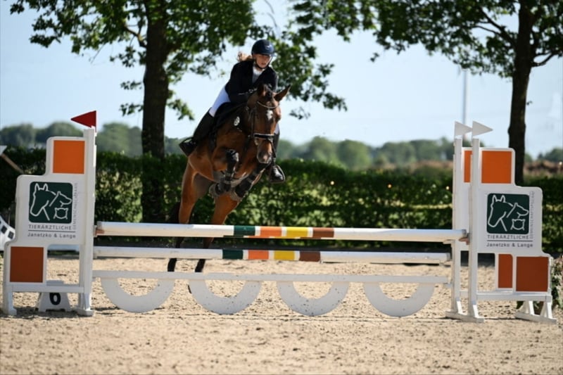 Zum Verkauf steht diese 6 jährige Stute Doerthe von Dembele L x Cayetano L. Wir haben sie damals als Fohlen gekauft und sie ist mit einer gleichaltrigen Stute auf der Wiese mit täglichem Menschenkontakt aufgewachsen. Doerthe wurde schonend Mitte 2023 angeritten. 2024 hat sie ihre ersten Turniererfahrungen gemacht. Sie zeigt kein guckiges Verhalten und möchte immer auf die andere Seite. Die Stute lässt sich dressur- und springmäßig gut arbeiten und ist lernwillig. Auf dem Turnier ist sie bis Springpferde L platziert und im Sommer für die Kreismeisterschaft eine Mannschaftsdressur a* gelaufen, die gewonnen wurde. Sie verzeiht einem jeden Reiterfehler und ist damit ein schönes Verlasspferd bzw. Amateurpferd. Röntgenbilder ohne Befund liegen bereits vor.