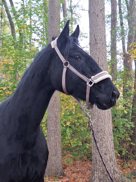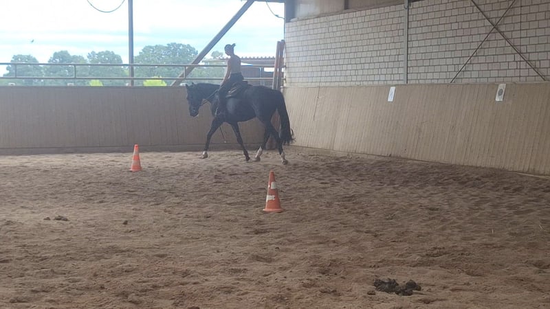 "DEUTSCHES SPORTPFERD" eine wunderschöne 5 jährige Rappstute mit einen Stockmaß von ca. 170cm. Diese Stute besticht nicht nur durch ihre Erscheinung, sondern auch durch ihr ausgeglichenes Wesen und ihre vielseitige Verlanlagung. Sie ist freizeitmäßig geritten und zeigt dich dabei stets brav und unkompliziert. Ob im Gelände , auf den Platz oder an der Longe Sie geht zuverlässig Schritt/Trab/Galopp. Gelassenheit: Sie ist wenig schreckhaft bis gar nicht und zeigt sich gegenüber neuen Situationen eher ruhiger. Aufgrund ihres Alters ist sie noch in der Entwicklung und braucht eine klare Konsequente Führung. Sie hinterfragt ab und zu Dinge ist dabei aber nicht böse, sondern einfach ihren jungen Alter entsprechend noch etwas unerfahren. Mit der richtigen bezugsperson, die Ihr Sicherheit und Struktur gibt, entwickelt sie sich zu einen tollen Partner. In der Herde ist sie eher Rang mittel/bis hoch. Abstammungstechnisch bringt sie interessante Veranlagung mit: mütterlicherseits dressurbetont, väterlicherseits aus den gehobenen spromgsport gezogen. Leider ist sie nicht eingetragen. Würde aber mit weiterer Ausbildung ein nettes Bild auf Turnier geben. Sie hat bisher noch nicht gestoppt vorm Sprung oder wassergraben. Kinder sind bereits auf ihr geritten wo sie sehr brav und Freundlich war. Dennoch wird sie nicht als reines kinderpony verkauft. Gesundheitlich ist zu erwähnen das sie eine leichte high-low Stellung vorne hat was man mit Beschlag gut korrigieren kann. Bei Interesse gerne per WhatsApp unter 0176 13478979 melden