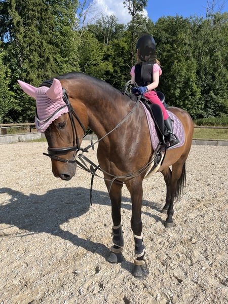 Se ofrece una yegua de carácter distintivo y expresión notable, nacida el 30 de abril de 2019, por Bernay x London Swing. Rendimiento y calidad: La yegua aprobó con éxito su prueba de rendimiento para yeguas y finalizó con una nota global de 7,37 (Danza 7,8 / Saltos 6,8). En la evaluación de su manejo, fue calificada con una excelente puntuación de 9,0. Está clasificada en concursos de doma clásica en la categoría A y destaca por sus excelentes movimientos básicos. Se dispone de un informe de salud sin defectos, incluyendo radiografías de columna y columna cervical. Información sobre su estado de salud: Debido a una enfermedad neurológica, actualmente no puede ser trabajada bajo el jinete. Por ello, se vende exclusivamente como yegua de cría. Paseos y galopes en paso son posibles sin problema. Para más información sobre el diagnóstico, no dudes en contactarme personalmente. Carácter y manejo: En el manejo diario, la yegua es una verdadera joya, muy fácil de tratar: tranquila en la herrería, con el veterinario y al cargar en el remolque. Puede ser manejada y cepillada sin dificultad por niños. No presenta comportamientos indeseados como cabeceo o balanceo. Cría: La yegua entra en celo regularmente y puede ser inseminada de inmediato. Gracias a su linaje, resultados de la prueba de rendimiento y su conformación convincente, posee excelentes condiciones para la cría. Precio a consultar. Para interés serio, agradecería un mensaje.