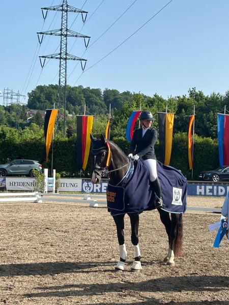 beispielhaft in Kondition und Konstitution, wirkungsvolle Erscheinung unter dem Sattel, vorbildliche natürliche Rittigkeit. Entwickelt viel Schwung. Gewann fünf A-Dressuren und ist in L-Dressur hochplatziert. Hatte als 10tägiges Fohlen einen Fesselbeinbruch, der erfolgreich operiert wurde. Sie wird deshalb deutlich unter Wert angeboten.
