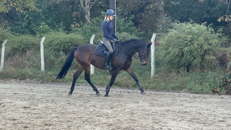 Eight-year-old dark bay mare with potential seeking a supportive home For sale is an 8-year-old dark bay mare with good basic gaits and lots of engagement. She is motivated under saddle, shows no vices such as rearing or bucking, and is herd-friendly. She enjoys hacking out and jumping, bringing great pleasure in both disciplines. She is well-behaved at the blacksmith's. She particularly demonstrates strong ambition when jumping, makes excellent efforts over fences, and remains completely fearless. Due to her temperament and versatility, I can also very well imagine her as a eventing horse. She is not a beginner's horse, as she occasionally requires a clear, consistent approach. For personal reasons, she has been worked well below her potential and has had several breaks—not due to injury, but for human reasons. The mare is in top condition and healthy; TÜV including back assessment available. A prompt sale is preferred. For uncomplicated, quick sale, there is room for negotiation. I wish for a loving home where she can be further supported and worked according to her potential. Approximate height: 16.1 hh; for orientation, the rider is about 17.8 hh. The mare had a break over the winter and we are now resuming training. To avoid riding tourism, a fee of €20 applies for a trial ride. Please note, this is a sales listing. No leasing or gifting due to special circumstances. I kindly ask to refrain from such inquiries. Thank you very much! €7,900 if collected by the end of February. Otherwise, €9,900 negotiable.