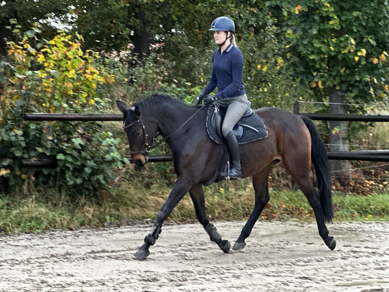 Achtjährige dunkelbraune Stute mit Potenzial sucht förderndes Zuhause Zum Verkauf steht eine 8-jährige, dunkelbraune Stute mit guten Grundgangarten und viel Engagement. Sie ist beim Reiten motiviert, zeigt keine Unarten wie Steigen oder Bocken und ist herdenverträglich. Beim Ausreiten sowie am Sprung macht sie große Freude. Beim Schmied ist sie brav. Besonders beim Springen zeigt sie sich sehr ehrgeizig, macht einen wirklich guten Sprung und ist dabei absolut unerschrocken. Aufgrund ihres Charakters und ihrer Vielseitigkeit kann ich sie mir auch sehr gut als Vielseitigkeitspferd vorstellen. Sie ist kein reines Anfängerpferd, da sie gelegentlich eine klare, konsequente Linie benötigt. Aufgrund persönlicher Gründe wurde sie bisher deutlich unter ihrem Potenzial gearbeitet und hatte mehrere Pausen – nicht verletzungsbedingt, sondern aus menschlichen Gründen. Die Stute ist topfit und gesund, TÜV inkl. Rücken liegt vor. Ein zeitnaher Verkauf wird bevorzugt. Bei unkomplizierten schnellen Verkauf besteht ein größer Verhandlungsspielraum. Ich wünsche mir ein liebevolles Zuhause, in dem sie weiter gefördert und ihrem Potenzial entsprechend gearbeitet wird. Größe ca 168, zur Orientierung die Reiterin ist ca 178 Die Stute hatte über den Winter nochmal Pause und nun starten wir wieder mit der Arbeit. Um Reittourismus zu vermeiden fällt 20€ für ein Probereiten an. Nochmal ein Hinweis, es handelt sich um eine Verkaufsanzeige. Kein zur Verfügung stellen und kein verschenken aufgrund besonderer Umstände. Ich würde mich sehr freuen wenn von solchen Anfragen abgesehen wird. Vielen Dank! 7900€ wenn sie bis Ende Februar abgeholt wird. Ansonsten 9900€ vb