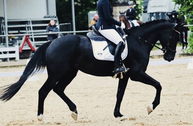 Beautiful 8-year-old elegant black mare – registered with the Bavarian Breeding Association – for sale. She produced a highly movement-oriented, premium Gold foal (Vitalis) at the age of four. The mare herself has multiple placings in A-Dressage and is already confidently competing in L-level tests. She happily and confidently jumps small fences under saddle. She has been gently backed and trained by us. Well-behaved in handling, sound and easy to load and shoe. The mare is being sold solely as a broodmare or leisure horse. *** For more information, please contact us only by phone at 0176/21305781! ***