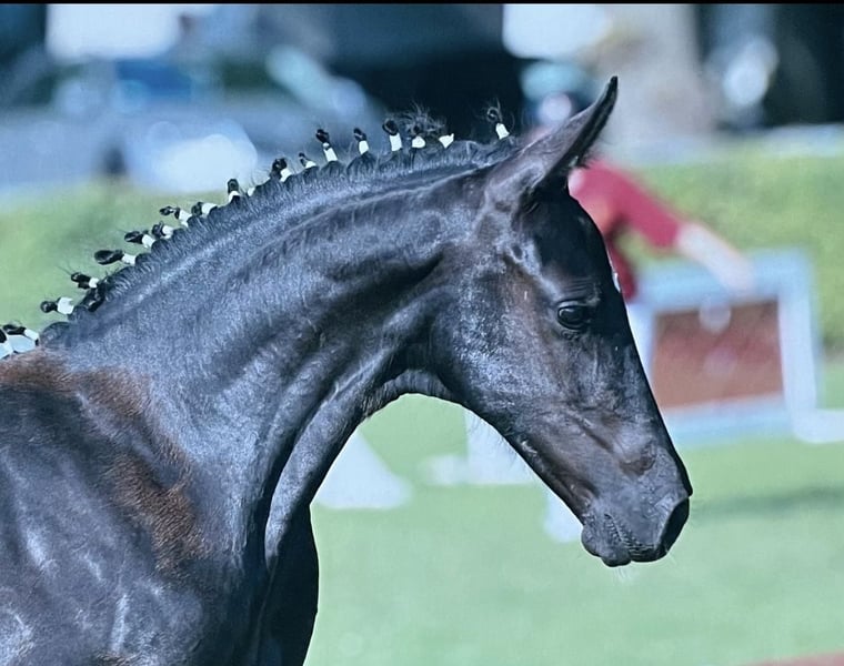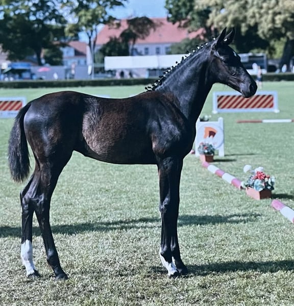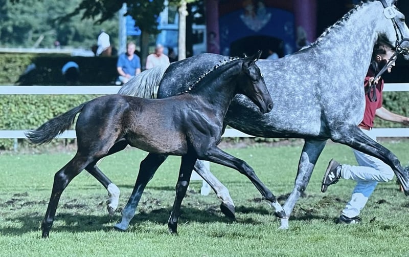 On April 16, 2025, our special filly "Eine wie keine" came into the world – and lives up to her name! Pedigree: • Sire: Element of Crime – a stallion with charisma, rideability, and excellent movement potential • Dam line: Belantis x Quaterback – proven dressage bloodlines with successes up to the highest level Achievements: • Foal show: 1st place • Foal championship Neustadt/Dosse: Brilliant ring Character & Movement: "Eine wie keine" impresses with her lively, curious, and intelligent character. Her movements are energetic, rhythmical, and characterized by natural balance – a promise for a successful future in the dressage arena. Special Features: • First-class genetics with proven top stallions in the direct line • Outstanding at both events – a true eye-catcher for breeding and sport For more information, please call 0179/7542321.