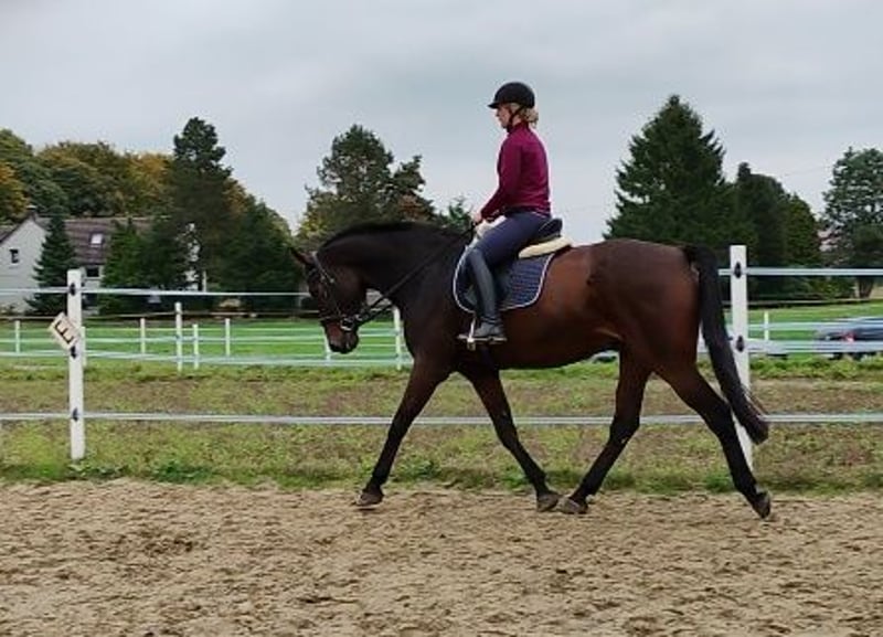 Freundlicher dunkelbrauner Wallach mit sportlicher Abstammung sucht ein neues, liebevolles Zuhause, in dem er seinen Platz als ehrlicher Freizeitpartner finden darf. Bisher wurde er auf Freizeitniveau geritten, war jedoch in den letzten Jahren aufgrund persönlicher Umstände nicht regelmäßig im Training und musste bei mir auch nie besonders viel tun. Er ist also unverbraucht und freut sich schon auf neue Aufgaben. Ich habe ihn selbst gezogen und er hat sein ganzes Leben nur bei mir verbracht. In dieser Zeit war er nie krank. Er wird barhuf gehalten und geritten. Da ich ihm aus beruflichen Gründen zeitlich nicht mehr gerecht werden kann und er sich eine feste Bezugsperson wünscht, die ihn fördert, möchte ich ihn nun schweren Herzens in gute Hände abgeben. Er ist brav im Umgang und zeichnet sich besonders durch sein freundliches und soziales Wesen aus. Aufgrund seiner Größe und der fehlenden Kontinuität unter dem Sattel ist er jedoch für Anfänger als Reitpferd ungeeignet. Er befindet sich zurzeit etwa auf E Niveau, hat aber gutes Potential für mehr. Er besitzt drei ordentliche Grundgangarten, im Springen wurde er bisher nicht gefördert. Er kennt sowohl Boxenhaltung, als auch den Sommer auf der Wiese, fühlt sich jedoch am wohlsten, wenn er am Abend, bei Hitze und besonders bei schlechtem Wetter in seine Box darf. Bei Interesse freuen wir uns über ein persönliches Kennenlernen. Weitere Informationen auf Anfrage.
