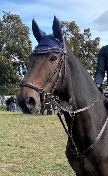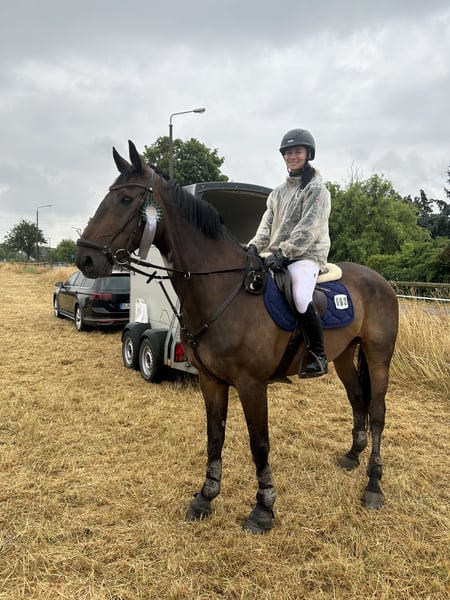 Zum Verkauf steht ein dunkelbrauner Wallach. Calgary G (Rufname Ossi) kam vor zwei Jahren als Schulpferd zu uns. Wir bildeten ihn weiter aus und stellten ihn dieses Jahr in seiner ersten richtigen Turniersaison in A* und A** -Springen sowie in Dressurprüfungen der Klasse A vor, wo er bereits einige Platzierungen sammeln konnte. Ossi geht allein oder in der Gruppe sicher ins Gelände, ist verladefromm und unkompliziert im Umgang. Wir wünschen uns für ihn einen ambitionierten Reiter oder Reiterin, der sicherer im A-Bereich werden möchte oder ins Turnierleben einsteigen will. Da ich mich nun vermehrt auf mein Nachwuchspferd konzentriere und nebenbei noch in der Ausbildung bin, kann ich Ossi zeitlich nicht mehr gerecht werden und würde mich sehr freuen, ein neues Für-immer zuhause für ihn zu finden!