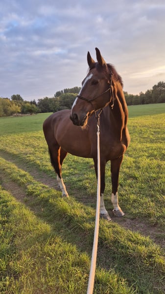 Liebenswerter Wallach "Cosimo" sucht liebevolles Zuhause. Ich suche für meinen treuen Begleiter Cosimo, ein 15-jähriges Deutsches Sportpferd (Wallach, 1,76 m), ein neues Zuhause, in dem er sein Leben mit Freude, Beschäftigung und viel Weidegang verbringen darf. Cosimo ist ein sehr aufgeschlossenes und braves Pferd mit Charakter. Er liebt den Kontakt zu Menschen und auch Kindern, freut sich über Bodenarbeit, Ausritte und ist für jeden Spaß zu haben. Er ist: - geländesicher und genießt Ausritte in vollen Zügen, im Fluss badet er auch gerne - regelmäßig mit seinem Menschen joggen gegangen - im Dressurviereck auf A-Niveau ausgebildet, wobei er je nach Tagesform Freude an der Arbeit zeigt. Aktuell wird er alle 2 Tage auf E/A- Niveau geritten. Dies sollte im gewissen Maße durchgeführt werden, damit er fit bleibt. - bodenarbeits- und freizeiterfahren - schmiedefromm und regelmäßig geimpft Aus gesundheitlichen Gründen (austherapierte Verletzung am Fesselträger) wird Cosimo nicht mehr gesprungen und ist nicht als Sportpferd abzugegeben. Stattdessen wünsche ich mir für ihn einen Platz als Beisteller und/oder Freizeitpartner für die entspannte Dressurarbeit, Ausritte, Bodenarbeit und einen liebevollen Umgang. Besonders wichtig ist mir, dass er viel Weidegang – auch im Winter – bekommt. Seine gesundheitliche Vorgeschichte erkläre ich gerne offen und ehrlich im persönlichen Gespräch. Preis auf Verhandlungsbasis – im Vordergrund steht für mich ein gutes, dauerhaftes Zuhause mit Herz und Verstand. Zubehör kann bei Bedarf mitverkauft werden – über den Preis sprechen wir individuell. Bei ernsthaftem Interesse freue ich mich auf deine Nachricht und ein Kennenlernen mit Cosimo!