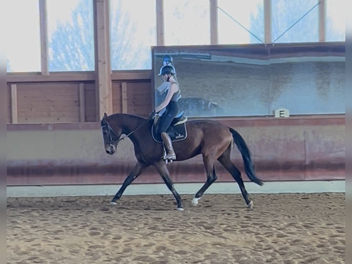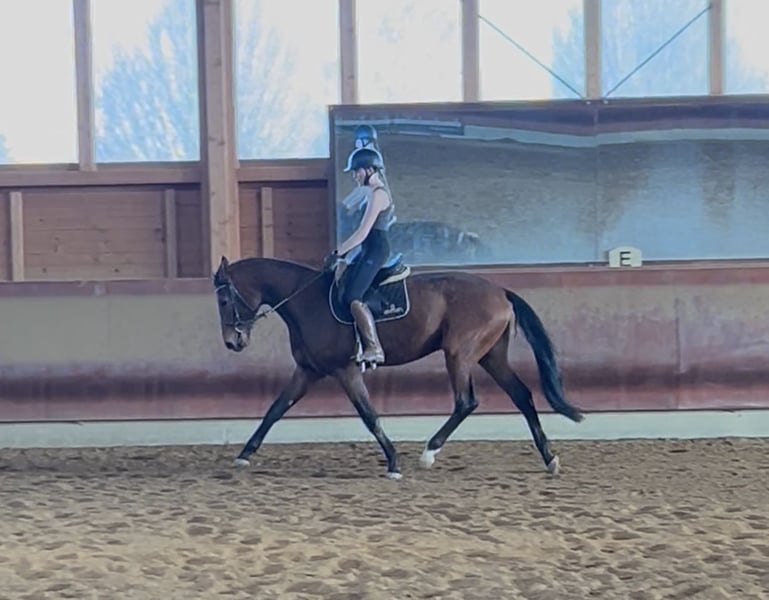 Escalante, bei uns Calli genannt ist ein 3 jähriger, 167cm großer DSP Wallach. Roh zu mir gekommen lernte er nun in seinem Tempo den Reiter kennen und zeigt sich in jeder Situation gelassen. Ausbildungsstand derzeit sind die GGA in der Halle, wo er mit weichen, ausdrucksstarken Gängen überzeugt. Er ist eher der Typ Pferd, der lieber alles erstmal ruhig und langsam angeht und nach und nach mit Sicherheit aufgeht. Daher ist er ein tolles Pferd für ambitionierte Freizeitreiter. Das Anreiten mit ihm hat sich unglaublich unkompliziert dargestellt. Er vertraut dem Menschen und kann Unklarheiten mit Ruhe lösen. Das macht ihn bereits jetzt zu einem sicheren Freizeitpartner. Charakterlich ist er total brav und durchgehend händelbar. Mit anderen Pferden gut verträglich und verspielt. Bei uns steht er in einer jungen Wallachgruppe. In der Rangordnung hält er sich mittig. Mit Stuten kommt er aber auch gut klar. Bei Fragen gerne unter 01702924716 telefonisch oder per WhatsApp. Privatverkauf.
