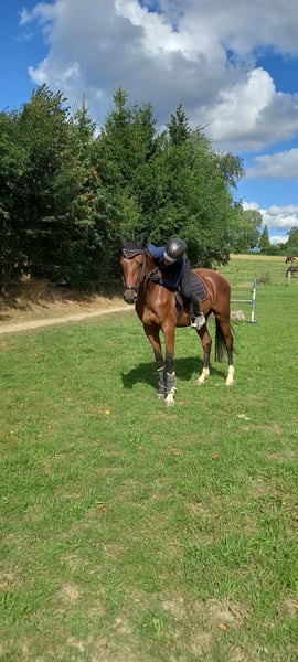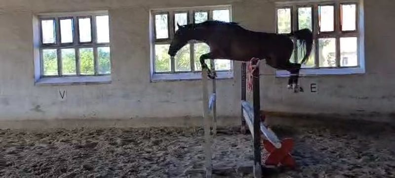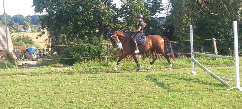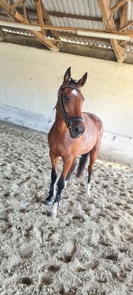 Zum Verkauf steht unser vierjähriger Wallach "Cool Heinz". Er ist ca. 159 cm groß und braun. Wie sein Name schon sagt ist er ein echt cooles und aufgeschlossenes Pferd welches seine Reiter durch seine Lernfreudigkeit und seine guten und feinen Reiteigenschaften immer wieder in seinen Bann zieht. Er ist sehr verspielt und dadurch für jeden Spaß zu haben. Er wird derzeit von einem 15 Jährigen Mädchen geritten und ist ein optimales "Mädchen- und Frauenpferd". Heinzi wurde im Frühjahr 2025 schonend angeritten und besitzt nun eine sehr gute dressurmäßige Grundausbildung. Er besitzt drei sehr gute Grundgangarten. Beim Freispringen zeigt er auch großes Potenzial für eine Zukunft im Springsport. In seiner weiteren Ausbildung soll er nun langsam an Sprünge unter dem Reiter herangeführt werden und auch an Ausritte ins Gelände gewöhnt werden. Er kennt unterschiedliche Reitplätze (Rasen und Sand) und auch andere Reiter. Seinem zukünftigen Reitern wird er viel Freude bereiten und soll in fördernde Hände abgegeben werden. Ein Probereiten ist möglich. Videos auf Anfrage. Bei ernsthaftem Interesse melden Sie sich gern.