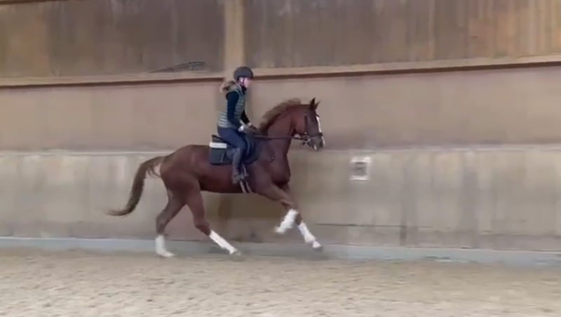Na sprzedaż wystawione jest wyjątkowe młode konie od D'avie FRH x Rubin Cortes OLD, które swoim pięknym umaszczeniem od razu przyciąga uwagę. Cztery białe "buty", przyjazna twarz i harmonijna budowa ciała wyróżniają go spośród innych. Został zacielony i rozpoczęty pod siodłem w wieku około 3 lat, więc jego poziom wyszkolenia można określić jako "świeżo zacielony". To koń szkoleniowy o dobrej podstawowej jakości i nowoczesnej sylwetce, idealny dla jeźdźca startującego w konkursach lub rekreacyjnego z doświadczeniem w pracy z młodymi końmi. Jego bezpośrednia matka, "Ruwina 3", odnosiła sukcesy pod Phillip Hess na poziomie S***. Jego ojciec, D'avie, był dwukrotnym Mistrzem Świata w konkurencji ujeżdżenia dla koni w wieku 6 i 7 lat, pod Severo Jurado Lopez, a w wieku zaledwie 9 lat odniósł zwycięstwo w Grand Prix pod Lisa Müller. Zachwyca nie tylko wyjątkowym talentem do ruchu, ale także doskonałym charakterem i ujezdnością. Już teraz D'avie jest znany z tego, że przekazuje swoje znakomite cechy zarówno w zakresie budowy, jak i ruchu swoim potomkom. Jego syn, "Democracy", został nagrodzony tytułem Prämienhengst na aukcji Hannoveraner w 2020 roku i jest użytkowany na stadninie Bonhomme. *Zdjęcie z wolnego wybiegu przedstawia go w wieku 2,5 lat.