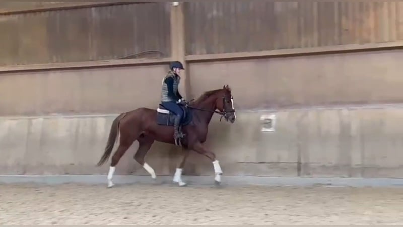 A special young horse by D'avie FRH x Rubin Cortes OLD is available for sale. Its striking markings immediately draw attention, featuring four white socks, an expressive face, and a harmonious conformation. He was backed and started under saddle at the beginning of his third year, so his training level can be described as "freshly backed." This is a quality young dressage prospect with modern appearance, suitable for a competitive or leisure rider with some experience in training young horses. His direct dam, "Ruwina 3," was successful under Phillip Hess at S*** level. His sire, D'avie, was double World Champion of the 6- and 7-year-old dressage horses under Severo Jurado Lopez and, at only nine years old, already achieved Grand Prix success under Lisa Müller. He impresses not only with his exceptional movement talent but also with his outstanding character and rideability. D'avie is already known for passing on his excellent interior and exterior qualities to his offspring. His son, "Democracy," was awarded premium stallion status at the Hannoveraner licensing in 2020 and is currently covering at Gestüt Bonhomme. *The free jumping photo shows him at 2.5 years old.*
